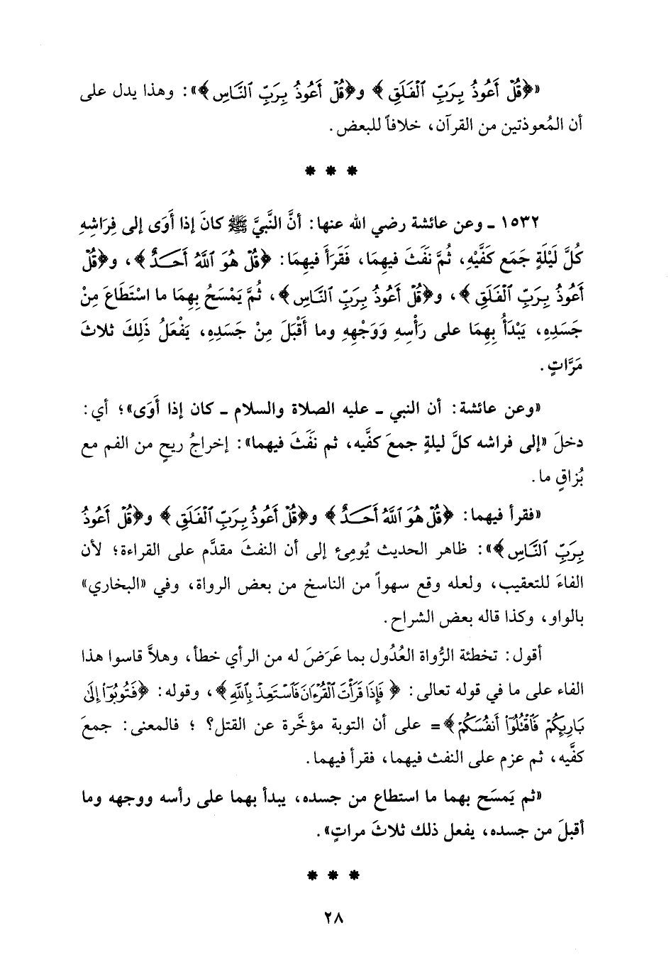 1532 - وعن عائشة رضي الله عنها: أن النَّبيَّ - صلى الله عليه وسلم - كانَ إذا أَوَى إلى فِرَاشِهِ كُلَّ لَيْلَةٍ جَمَع كَفَّيْهِ، ثُمَّ نَفَثَ فيهِمَا، فَقَرَأَ فيهِمَا: {قُلْ هُوَ اللهُ أَحَدٌ}، و {قُلْ أَعُوذُ بِرَبِّ الْفَلَقِ} و {قُل أَعُوذُ بِرَبِّ الْنَّاسِ}، ثُمَّ يَمْسَحُ بِهِمَا ما اسْتَطَاعَ مِنْ جَسَدِهِ، يَبْدَأُ بِهِمَا على رَأْسِهِ وَوَجْهِهِ وما أَقْبَلَ مِنْ جَسَدِهِ، يَفْعَلُ ذَلِكَ ثلاثَ مَرَاتٍ.