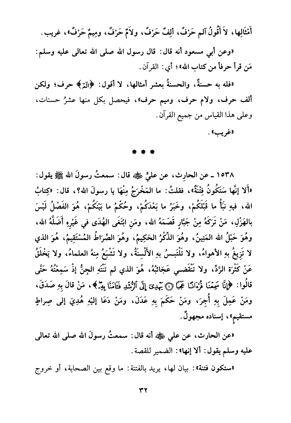 1538 - عن الحارِث، عن عليٍّ - رضي الله عنه - قال: سمعتُ رسولَ الله - صلى الله عليه وسلم - يقول: "أَلا إنَّها سَتكُونُ فِتْنَةٌ"، فقلتُ: ما المَخْرَجُ مِنْهَا يا رسولَ الله؟، قال: "كِتابُ الله، فيهِ نَبَأُ ما قَبْلَكُمْ، وخَبَرُ ما بَعْدَكُمْ، وحُكْمُ ما بَيْنَكُمْ، هُوَ الفَصْلُ ليْسَ بالهَزْلِ، مَنْ تَرَكَهُ مِنْ جَبَّارٍ قَصَمَهُ الله، ومَنِ ابْتَغَى الهُدَى في غَيْرِهِ أَضَلَّهُ الله، وهُوَ حَبْلُ الله المَتِينُ، وهُوَ الذِّكْرُ الحَكِيمُ، وهُوَ الصِّرَاطُ المُسْتَقِيمُ، هُوَ الذي لا تَزِيغُ بهِ الأهواءُ، ولا تَلْتَبسُ بهِ الأَلْسِنَةُ، ولا تَشْبَعُ مِنهُ العلماءُ، ولا يَخْلَقُ عَنْ كَثْرَة الرَّدِّ، ولا تَنْقَضي عَجَائبُهُ، هُوَ الذي لم تَنْتَهِ الجِنُّ إذْ سَمِعْتُهُ حَتَّى قالُوا: {إِنَّا سَمِعْنَا قُرْآنًا عَجَبًا (1) يَهْدِي إِلَى الرُّشْدِ فَآمَنَّا بِهِ}، مَنْ قالَ بِهِ صَدَقَ، ومَنْ عَمِل بِهِ أُجِرَ، ومَنْ حَكَمَ بِهِ عَدَلَ، ومَنْ دَعَا إليْهِ هُدِيَ إلى صِراطٍ مستقيمٍ"، إسناده مجهولٌ.