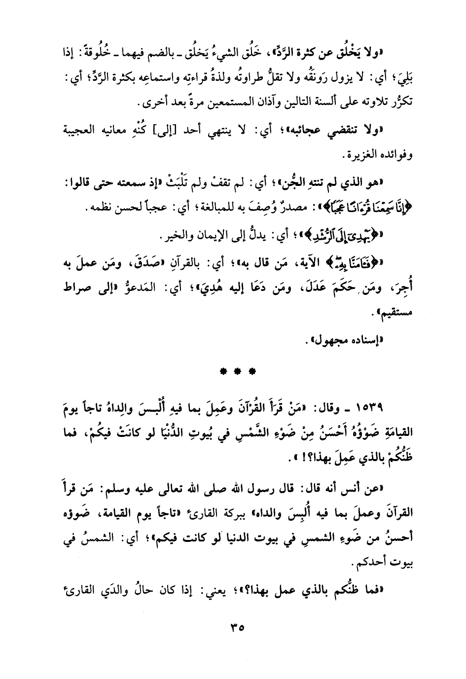 1539 - وقال: "مَنْ قَرَأَ القُرْآنَ وعَمِلَ بما فيهِ أُلْبسَ والِداهُ تاجًا يومَ القيامَةِ ضَوْؤُهُ أَحْسَنُ مِنْ ضَوْءِ الشَّمْسِ في بُيوتِ الدُّنْيَا لو كانَتْ فيكُمْ، فما ظَنُّكُمْ بالذي عَمِلَ بهذا؟! ".
