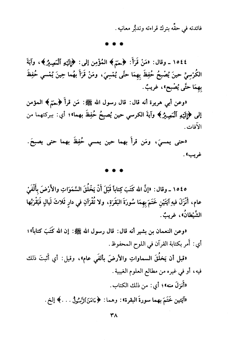 1545 - وقال: "إنَّ الله كَتَبَ كِتابًا قَبْلَ أَنْ يَخْلُقَ السَّمَوَاتِ والأَرْضَ بِأَلْفَيْ عام، أَنْزَلَ فيهِ آيَتَيْنِ خَتَمَ بِهِمَا سُورَةَ البَقَرَةِ، ولا تُقْرَآنِ في دارٍ ثَلاثَ لَيالٍ فَيَقْرَبُها الشَّيْطانُ"، غريبٌ.