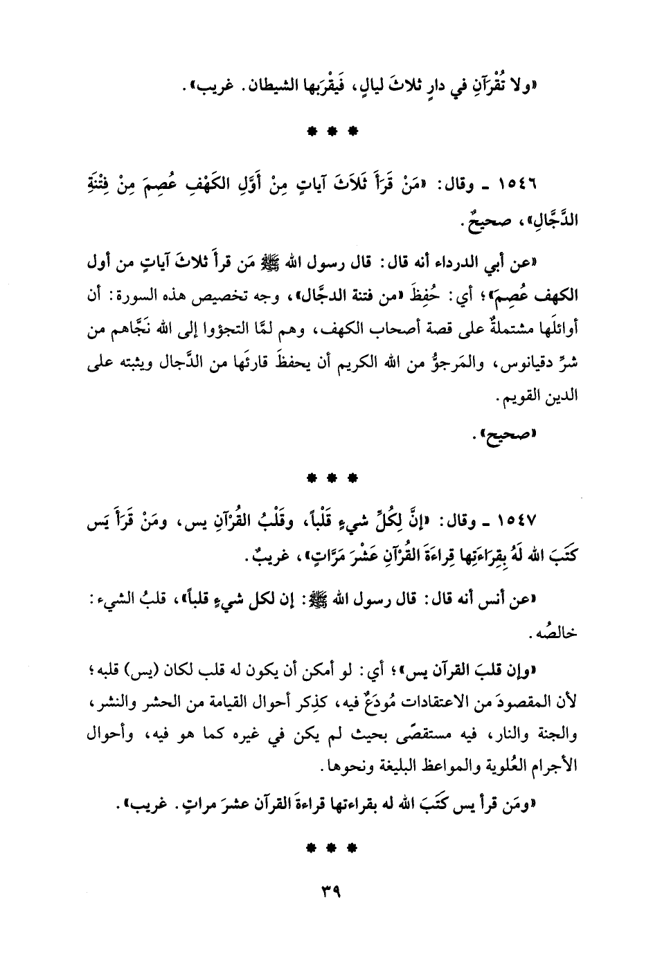 1546 - وقال: "مَنْ قَرَأَ ثَلاَثَ آياتٍ مِنْ أَوَّلِ الكَهْفِ عُصِمَ مِنْ فِتْنَةِ الدَّجَّالِ"، صحيح.