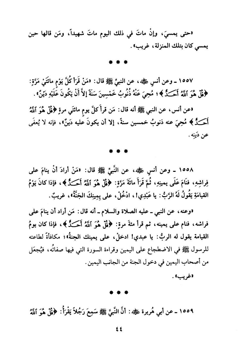 1558 - وعن أنسٍ - رضي الله عنه -، عن النَّبيِّ - صلى الله عليه وسلم - قال: "مَنْ أرادَ أنْ ينامَ على فِراشِهِ، فنَامَ عَلَى يمينِهِ، ثُمَّ قَرَأَ مائَةَ مَرَّةٍ: {قُلْ هُوَ اللَّهُ أَحَدٌ}، فإذا كانَ يَوْمُ القيامَةِ يَقُولُ لَهُ الرّبُّ: يا عَبْدِي!، ادْخُلْ، على يِمِينِكَ الجَنَّةُ"، غريبٌ.