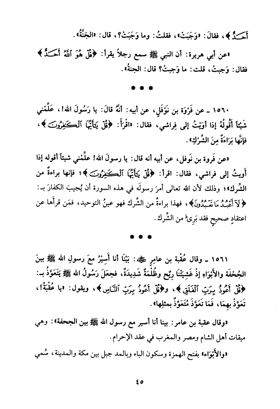 1561 - وقال عُقْبة بن عامِرٍ - رضي الله عنه -: بَيْنَا أنا أَسِيْرُ معَ رسولِ الله - صلى الله عليه وسلم - بينَ الجُحْفَة والأَبْوَاءِ إذْ غَشِيَتْنَا رِيحٌ وظُلْمَة شَدِيدَةٌ، فجعَلَ رَسُولُ الله - صلى الله عليه وسلم - يَتَعَوَّذُ بـ: {قُلْ أَعُوذُ بِرَبِّ الْفَلَقِ}، و {قُلْ أَعُوذُ بِرَبِّ النَّاسِ}، ويقول: "يا عُقْبَةُ!، تَعَوَّذْ بهِمَا، فَمَا تَعَوَّذَ مُتَعَوِّذٌ بمثلِها".