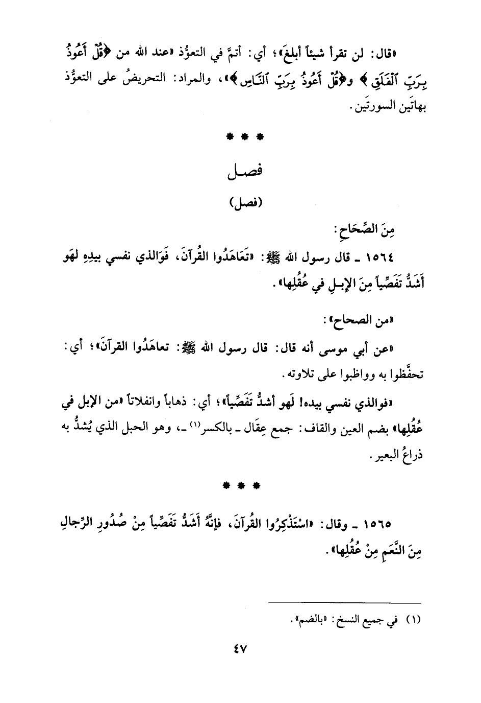 1564 - قال رسول الله - صلى الله عليه وسلم -: "تَعَاهَدُوا القُرآنَ، فَوَالذي نفسي بيدِهِ لهَو أَشَدُّ تَفَصِّيًا مِنَ الإِبلِ في عُقُلِها".