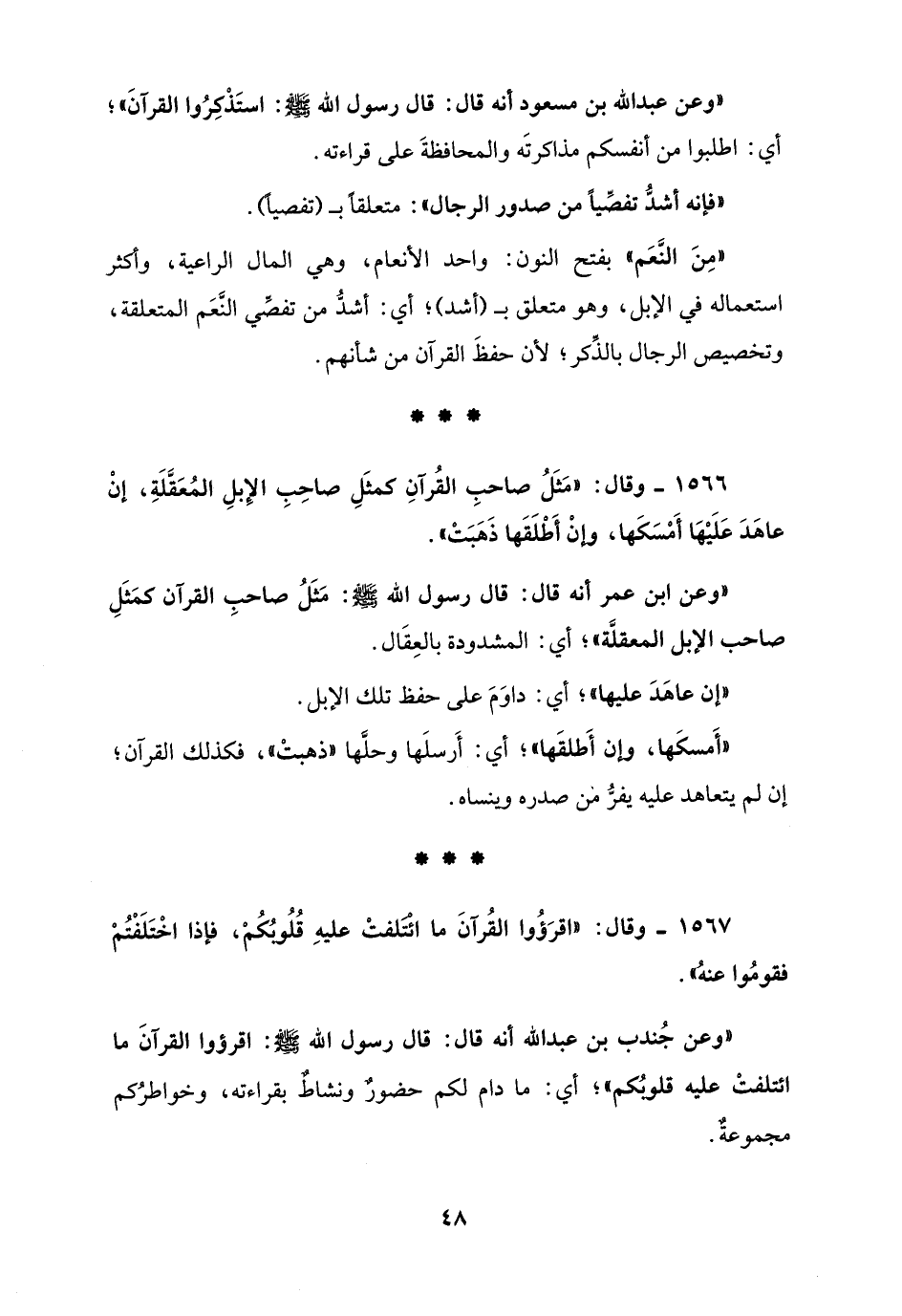 1566 - وقال: "مَثَلُ صاحبِ القُرآنِ كمثَلِ صاحِبِ الإِبلِ المُعَقَّلَةِ، إنْ عاهَدَ عَلَيْهَا أَمْسَكَها، وإنْ أَطْلَقَها ذَهَبَتْ".