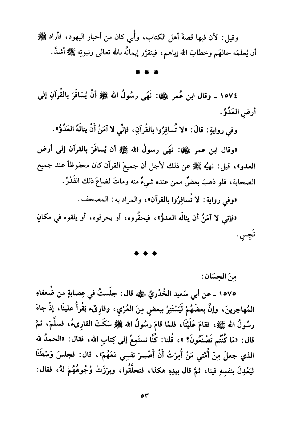1574 - وقال ابن عُمر - رضي الله عنهما -: نَهَى رسُولُ الله - صلى الله عليه وسلم - أنْ يُسَافَرَ بالقُرآنِ إلى أرضِ العَدُوِّ.