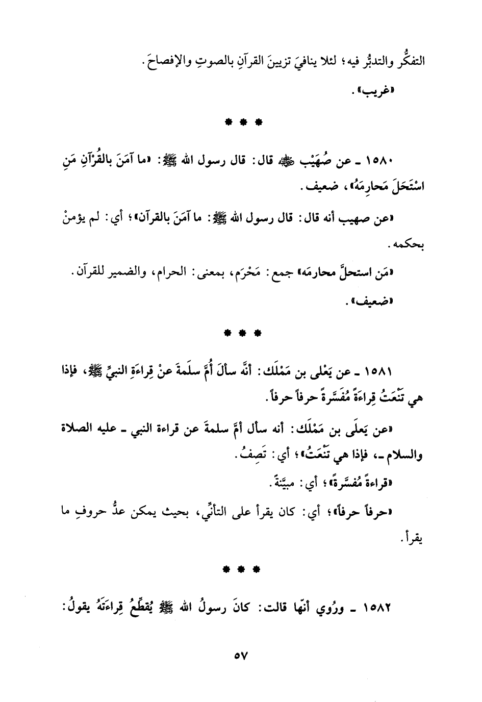 1580 - عن صُهَيْب - رضي الله عنه - قال: قال رسول الله - صلى الله عليه وسلم -: "ما آمَنَ بالقُرْآنِ مَنِ اسْتَحَلَ مَحارِمَهُ"، ضعيف.
