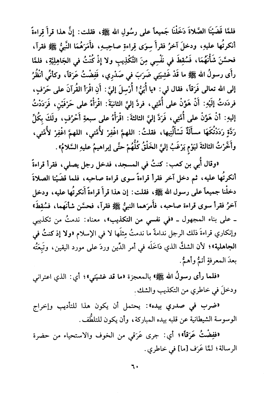 فلمَّا قَضَيْنَا الصَّلاةَ دَخَلْنَا جَميعًا على رسُولِ الله - صلى الله عليه وسلم -، فقلت: إنَّ هذا قرأَ قِراءةً أنكرتُها عليهِ، ودخلَ آخرُ فقرأَ سِوَى قِراءةِ صاحِبهِ، فأَمَرَهُمَا النَّبيّ - صلى الله عليه وسلم - فقرآ، فحسَّنَ شَأْنَهُمَا، فَسُقِطَ في نَفْسِي مِنَ التَّكْذِيبِ ولا إذْ كُنْتُ في الجَاهِلِيَّةِ، فلمَّا رأَى رسولُ الله - صلى الله عليه وسلم - قَدْ غَشِيَنِي ضَرَبَ في صَدْرِي، فَفِضْتُ عَرَقًا، وكأنِّي أنْظُرُ إلى الله تعالى فَرَقًا، فقال لي: "يا أُبَيُّ! أُرْسِلَ إليَّ: أَنِ اقْرَأ القُرآنَ على حَرْفٍ، فردَدتُ إلَيْهِ: أَنْ هَوِّنْ على أُمَّتِي، فردَّ إليَّ الثانيَةَ: اقْرَأْهُ على حَرْفَيْنِ، فَرَدَدْتُ إليهِ: أنْ هَوِّنْ على أُمَّتِي، فَرَدَّ إليَّ الثالثةَ: اقْرَأْهُ على سبعةِ أَحْرُفٍ، ولَكَ بِكُلِّ رَدَّةٍ رَدَدْتُكَهَا مسأَلَةٌ تَسْأَلُنِيها، فقلتُ: اللهمَّ اغْفِرْ لأُمَّتي، اللهمَّ اغْفِرْ لأُمَّتي، وأَخَّرْتُ الثالثةَ ليَوْمٍ يَرْغَبُ إليَّ الخَلْقُ كُلُّهُمْ حتَّى إبراهيمُ عليهِ السَّلامُ".