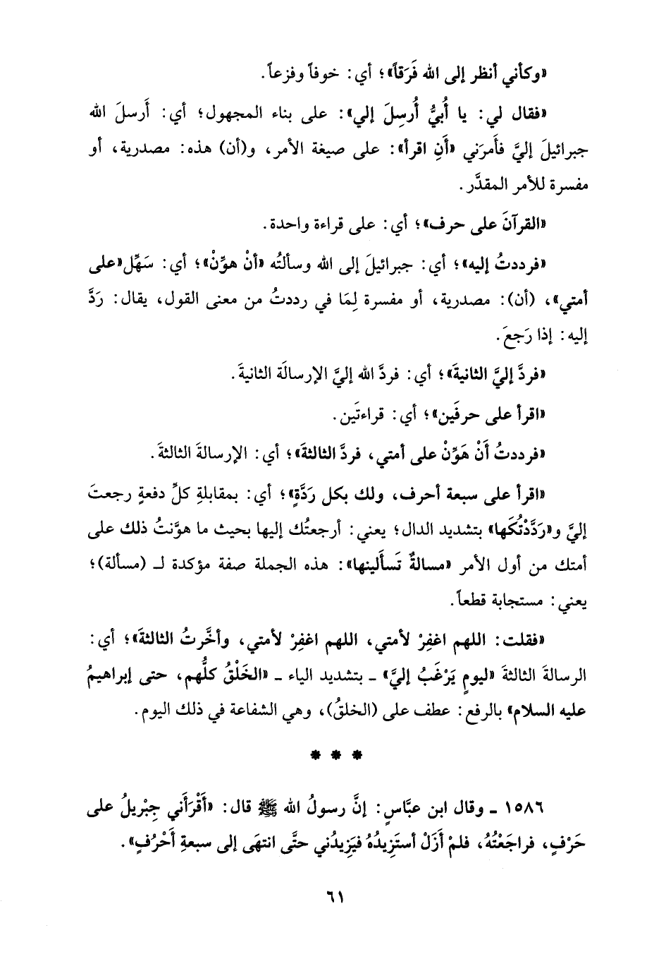 1586 - وقال ابن عبَّاسٍ: إنَّ رسولُ الله - صلى الله عليه وسلم - قال: "أَقْرَأَني جِبْريلُ على حَرْفٍ، فراجَعْتُهُ، فلمْ أَزَلْ أستَزِيدُهُ فيَزِيدُني حتَّى انتهَى إلى سبعةِ أَحْرُفٍ".