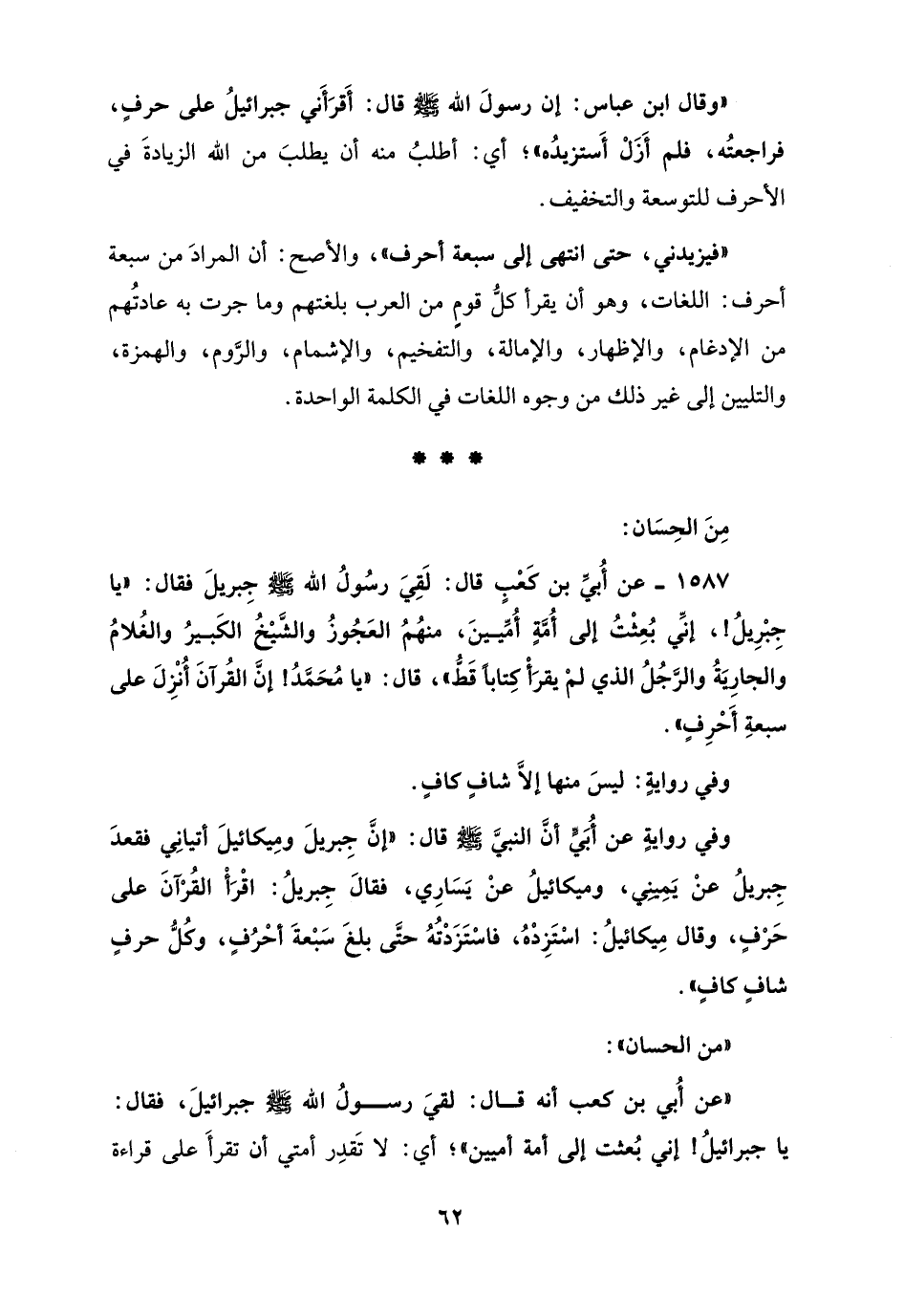 1587 - عن أُبيِّ بن كَعْبٍ قال: لَقِيَ رسُولُ الله - صلى الله عليه وسلم - جِبريلَ فقال: "يا جِبْرِيلُ!، إنِّي بُعِثْتُ إلى أُمَّةٍ أُمِّيينَ، منهُمُ العَجُوزُ والشَّيْخُ الكَبيرُ والغُلامُ والجارِيَةُ والرَّجُلُ الذي لَمْ يقرَأْ كِتابًا قَطُّ"، قال: "يا مُحَمَّدُ! إنَّ القُرآنَ أُنْزِلَ على سبعةِ أَحْرِفٍ".