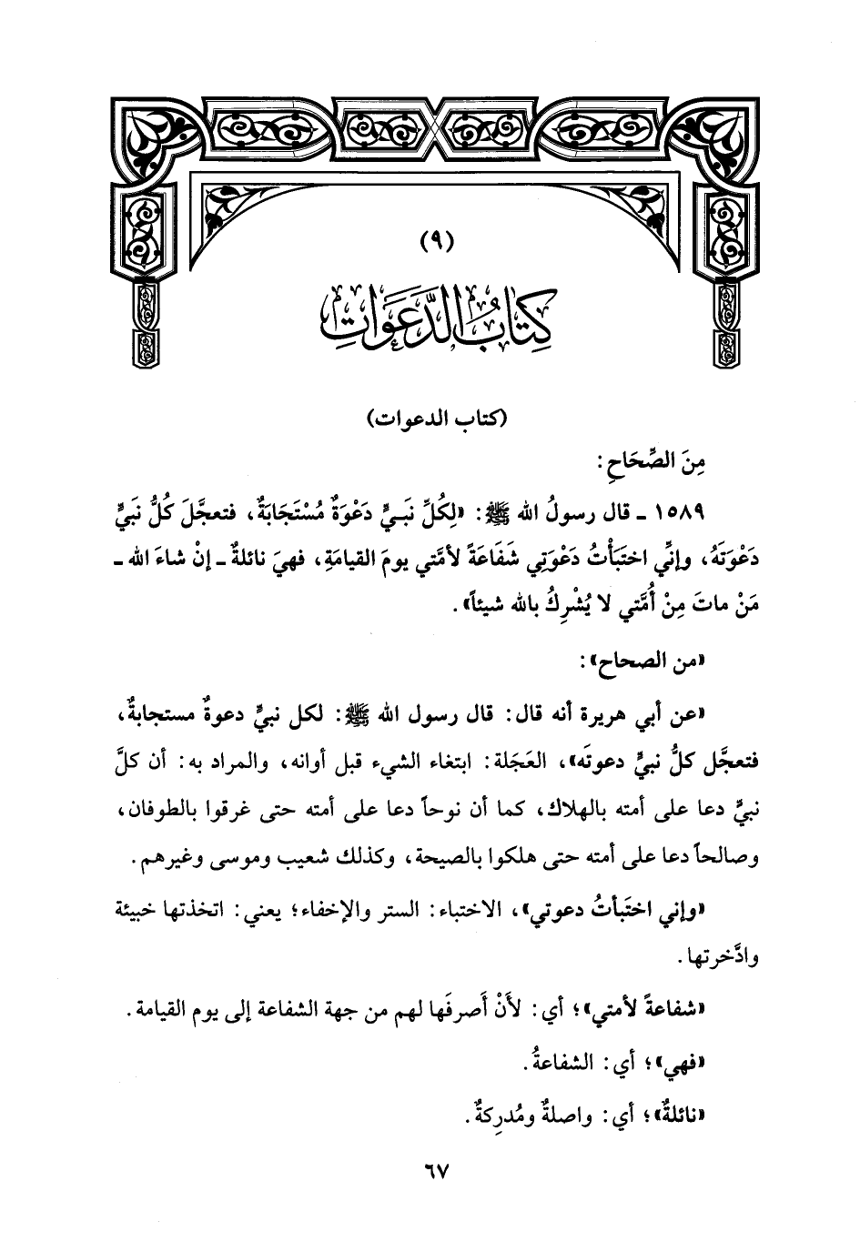 1589 - قال رسولُ الله - صلى الله عليه وسلم -: "لِكُلِّ نبَيٍّ دَعْوَةٌ مُسْتَجَابَةٌ، فتعجَّلَ كُلُّ نبَيٍّ دَعْوَتَهُ، وإنِّي اختَبَأْتُ دَعْوَتِي شَفَاعَةً لأمَّتي يومَ القيامَةِ، فهيَ نائلةٌ - إنْ شاءَ الله - مَنْ ماتَ مِنْ أُمَّتي لا يُشْرِكُ بالله شيئًا".