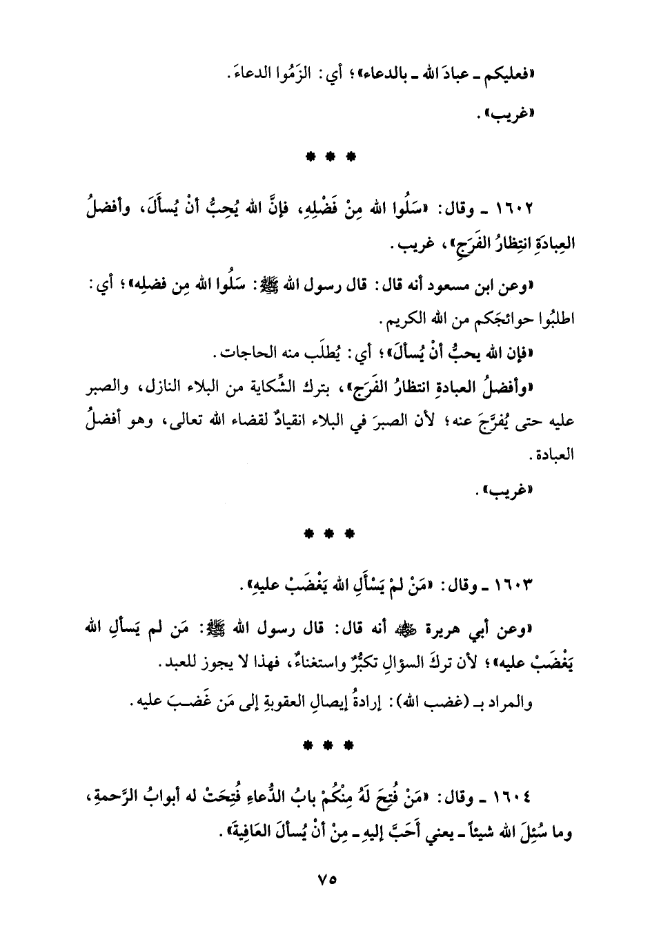 1604 - وقال: "مَنْ فُتِحَ لَهُ مِنْكُمْ بابُ الدُّعاءِ فُتِحَتْ له أبوابُ الرَّحمةِ، وما سُئِلَ الله شيئًا - يعني أَحَبَّ إليهِ - مِنْ أنْ يُسألَ العَافِيةَ".