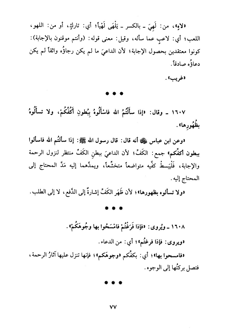1607 - وقال: "إذا سأَلْتُمُ الله فاسْأَلُوهُ بِبُطونِ أَكُفِّكُمْ، ولا تسأَلُوهُ بظُهُورِها".