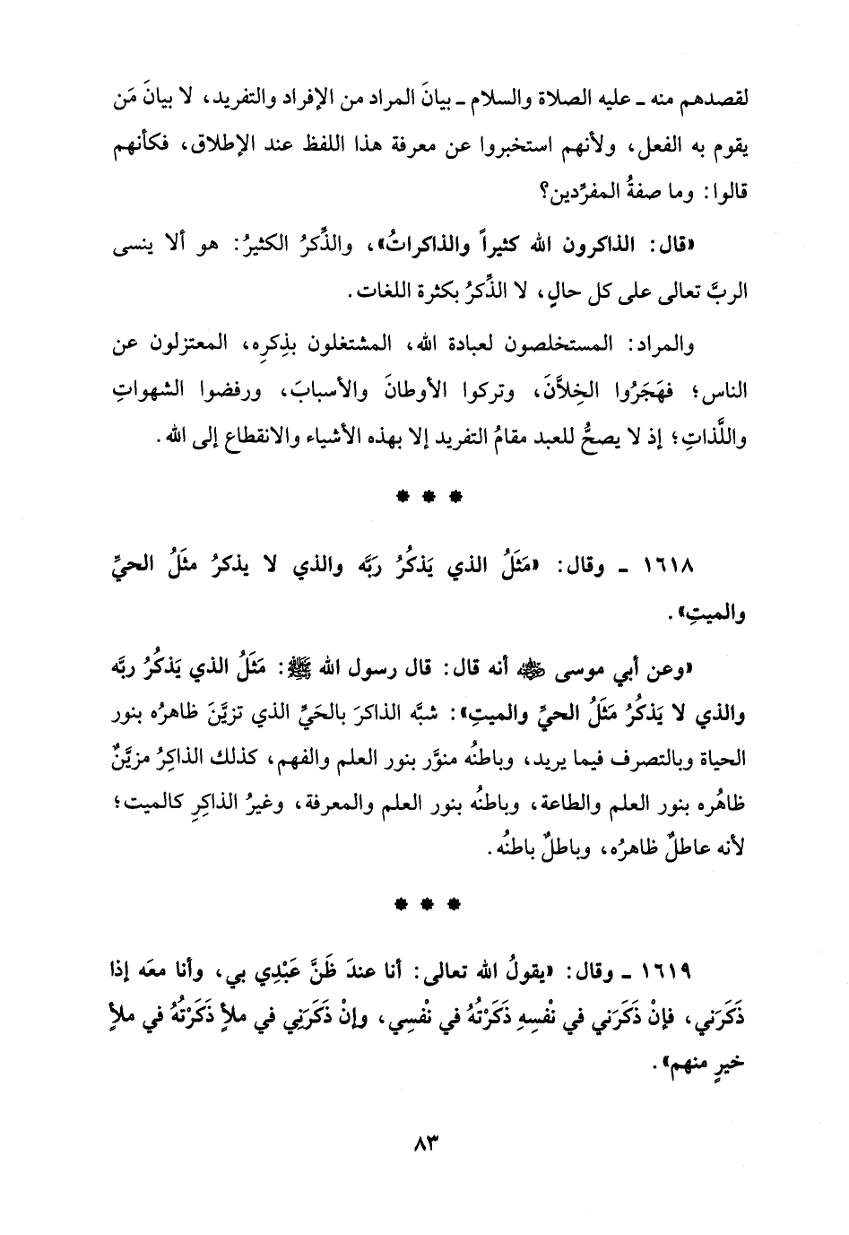 1618 - وقال: "مَثَلُ الذي يَذكُرُ رَبَّه والذي لا يذكرُ مثَلُ الحيِّ والميتِ".