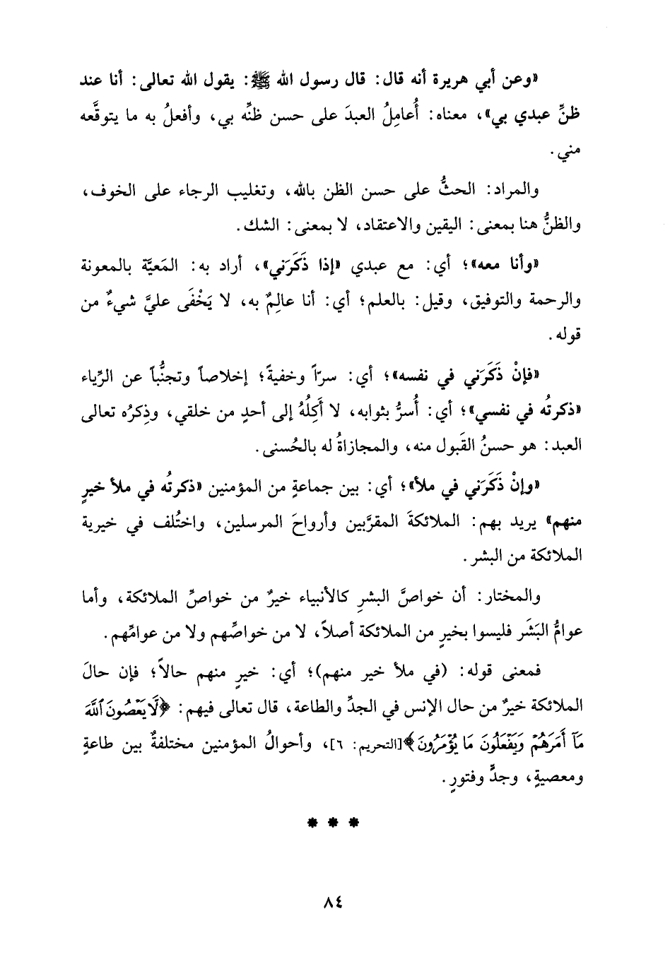 "وعن أبي هريرة أنه قال: قال رسول الله - صلى الله عليه وسلم -: يقول الله تعالى: أنا عند ظنِّ عبدي بي"، معناه: أُعامِلُ العبدَ على حسن ظنِّه بي، وأفعلُ به ما يتوقَّعه مني.