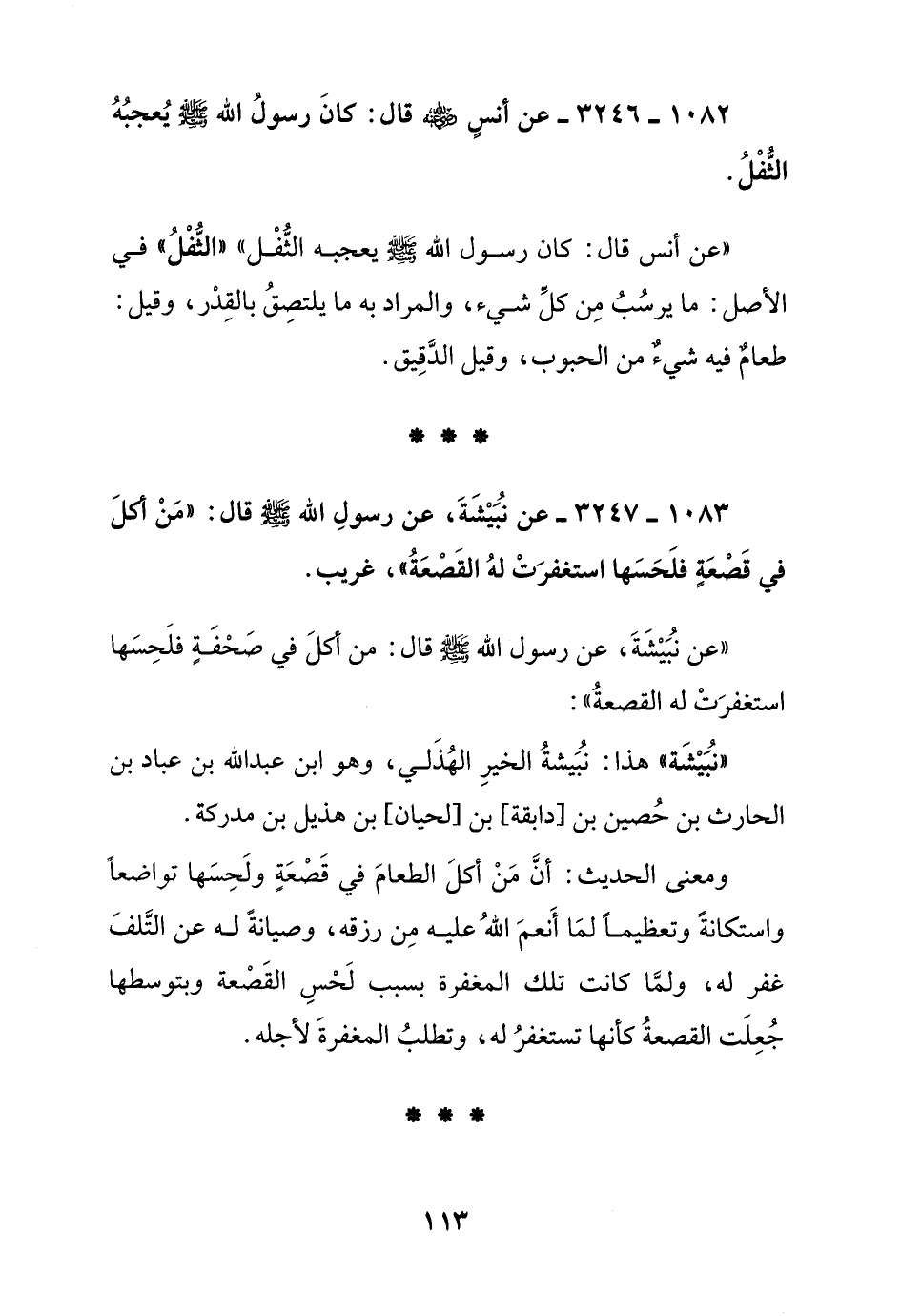 1082 – 3246 – عن أنس رضي الله عنه قال: كان رسول الله صلى الله عليه وسلم يعجبه الثفل"