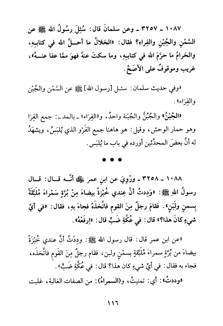 1088 – 3258 – وروي عن ابن عمر رضي الله عنهما أنه قال: قال رسول الله صلى الله عليه وسلم: "وددت أن عندي خبزة بيضاء من برة سمراء ملبقة بسمن ولبن" فقام رجل من القوم فاتخذه فجاء به, فقال: "في أي شيء كان هذا؟ قال: في عكة ضب قال: "ارفعه"
