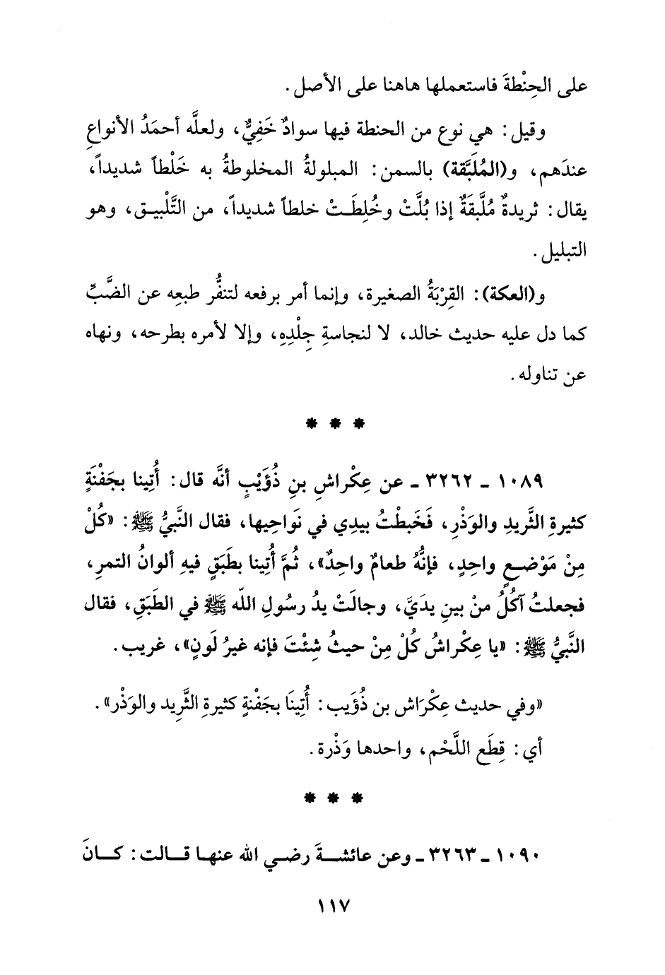 1089 – 3262 – عن عكراش بن ذؤيب أنه قال: أتينا بجفنة كثيرة الثريد والوذر, فخبطت بيدي في نواحيها, فقال النبي صلى الله عليه وسلم:"كل من موضع واحد, فإنه طعام واحد" ثم أتينا بطبق فيه ألوان التمر, فجعلت آكل من بين يدي, وجالت يد رسول الله صلى الله عليه وسلم في الطبق, فقال النبي صلى الله عليه وسلم: "يا عكراش كل من حيث شئت فإنه غير لون" غريب.