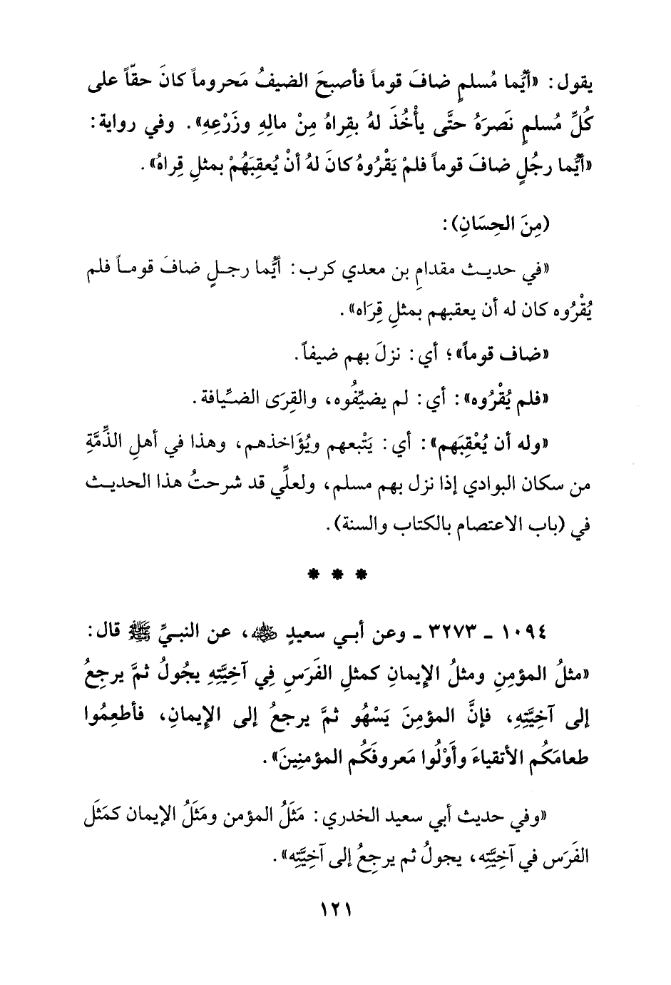 1094 - 3273 - وعن أبي سعيد رضي الله عنه, عن النبي صلى الله عليه وسلم قال: "مثل المؤمن ومثل الإيمان كمثل الفرس في آخيته يجول ثم يرجع إلى آخيته, فإن المؤمن يسهو ثم يرجع إلى الإيمان, فأطعموا طعامكم الأتقياء وأولوا معروفكم المؤمنين"