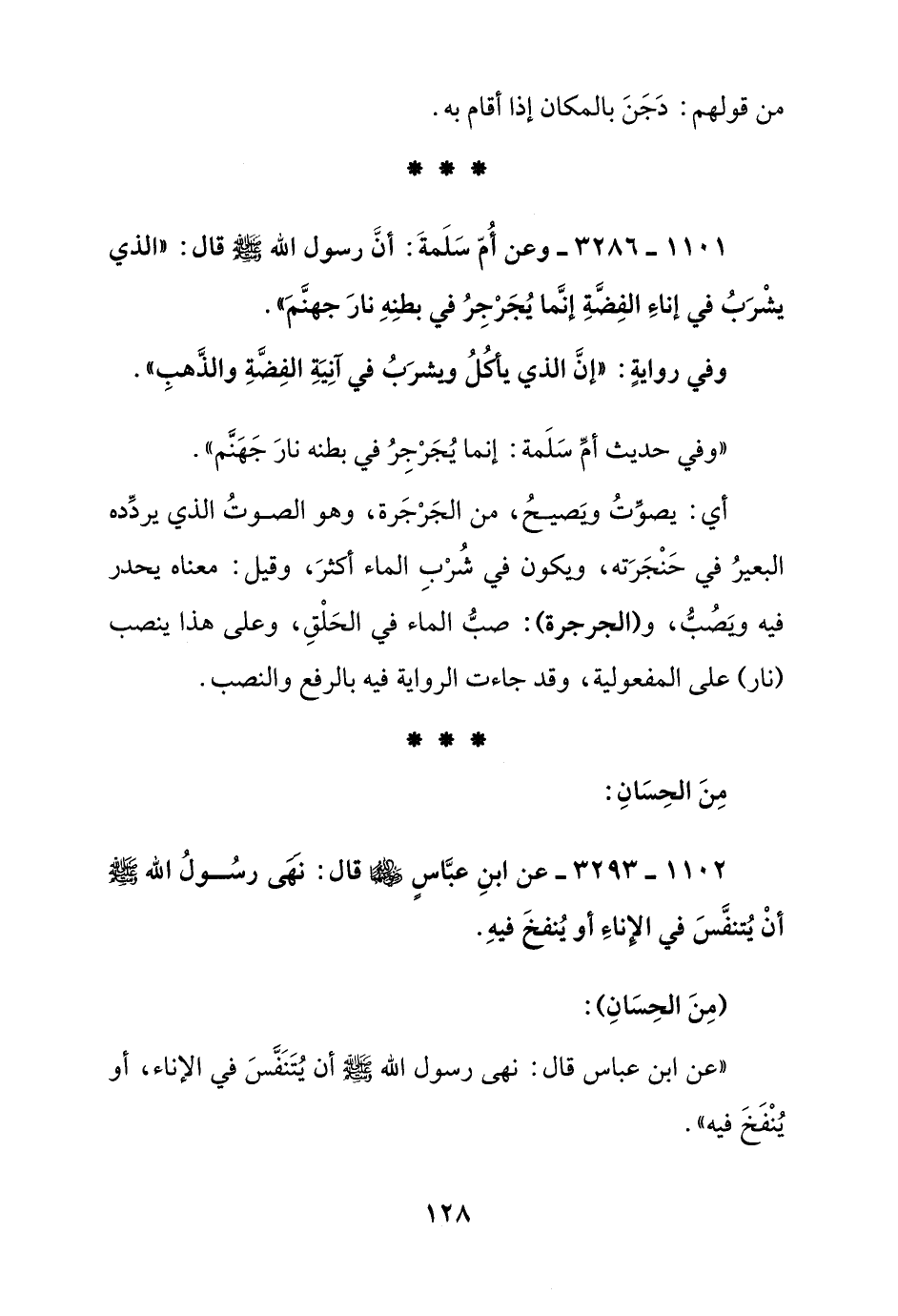 1101 - 3286 - وعن أم سلمة: أن رسول الله صلى الله عليه وسلم قال: "الذي يشرب في إناء الفضة إنما يجرجر في بطنه نار جهنم"