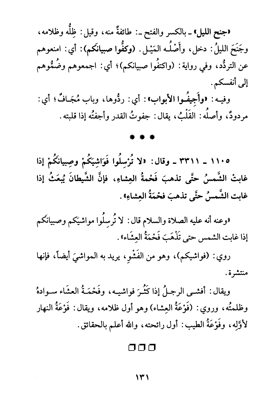 "وعنه أنه عليه الصلاة والسلام قال: لا ترسلوا مواشيكم وصبيانكم إذا غابت الشمس حتى تذهب فحمة العشاء"