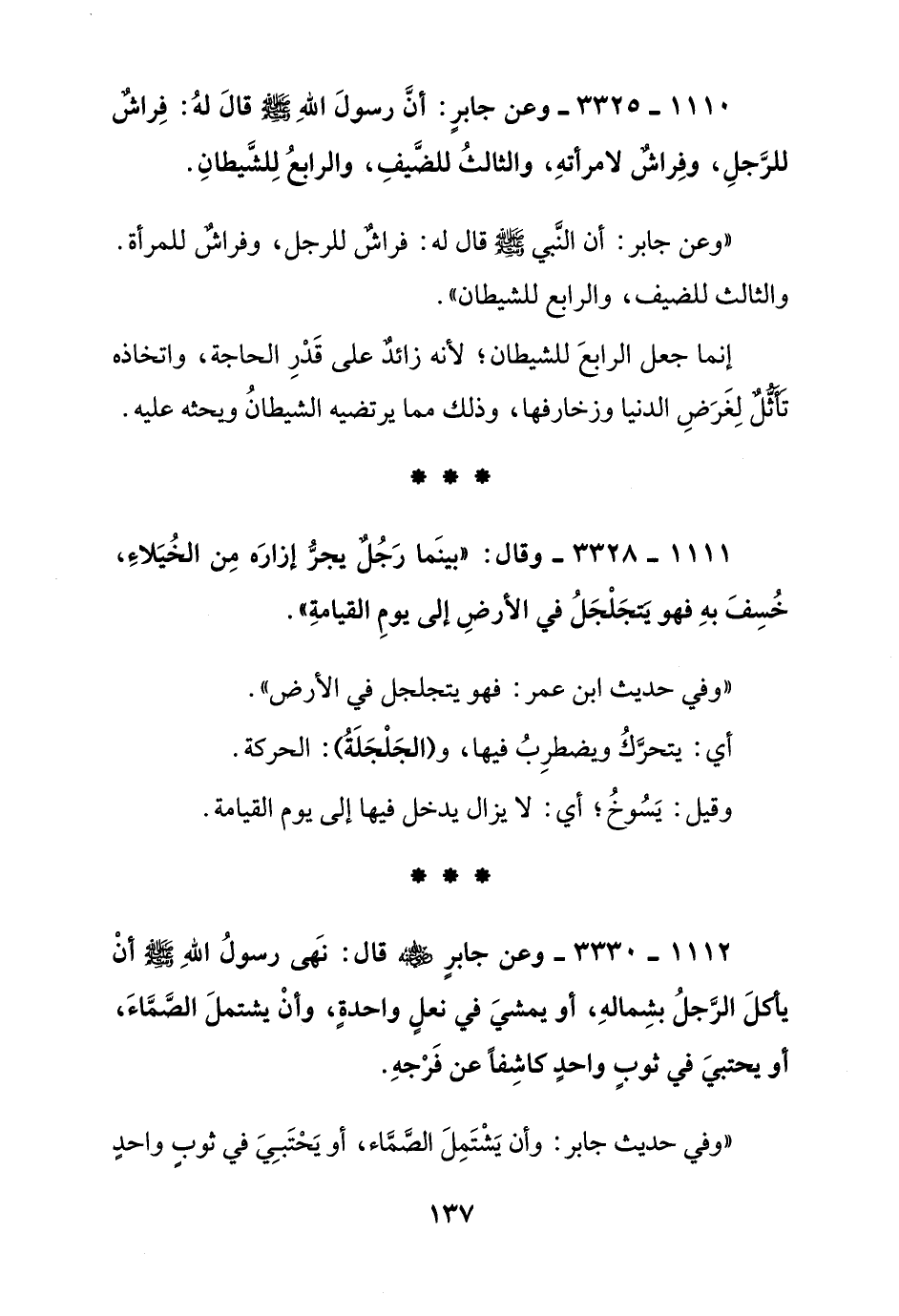 1110 - 3325 - وعن جابر: أن رسول الله صلى الله عليه وسلم قال له: فراش للرجل, وفراش لامرأته, والثالث للضيف, والرابع للشيطان.