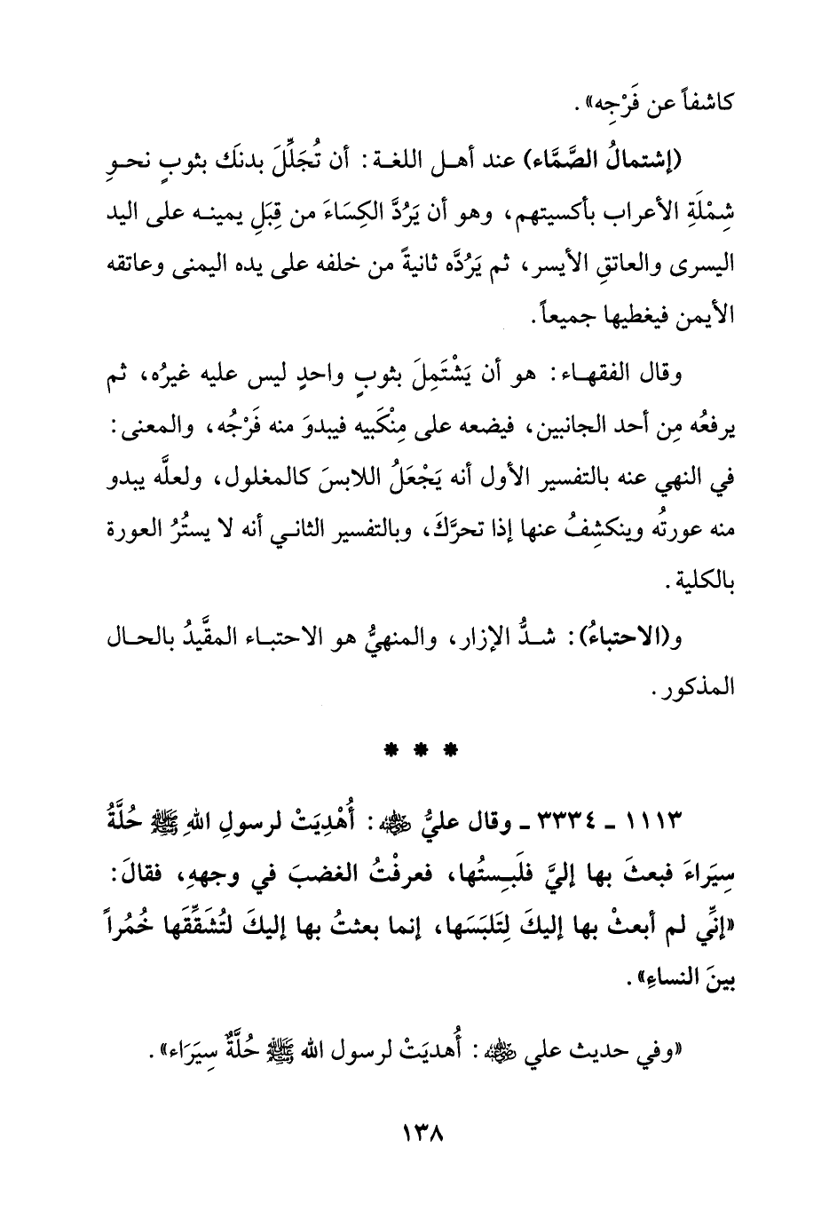 وقال الفقهاء: هو أن يشتمل بثوب واحد ليس عليه غيره, ثم يرفعه من أحد الجانبين, فيضعه على منكبيه فيبدو منه فرجه, والمعنى: في النهى عنه بالتفسير الأول أنه يجعل اللابس كالمغلول, ولعله يبدو منه عورته وينكشف عنها إذا تحرك, وبالتفسير الثاني أنه لا يستر العورة بالكلية.