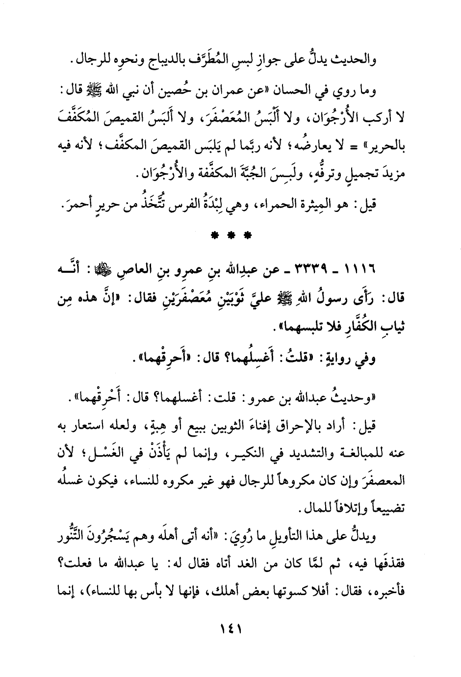 1116 - 3339 - عن عبد الله بن عمرو بن العاص رضي الله عنهما: أنه قال: رأى رسول الله صلى الله عليه وسلم على ثوبين معصفرين فقال: "إن هذه من ثياب الكفار فلا تلبسهما"