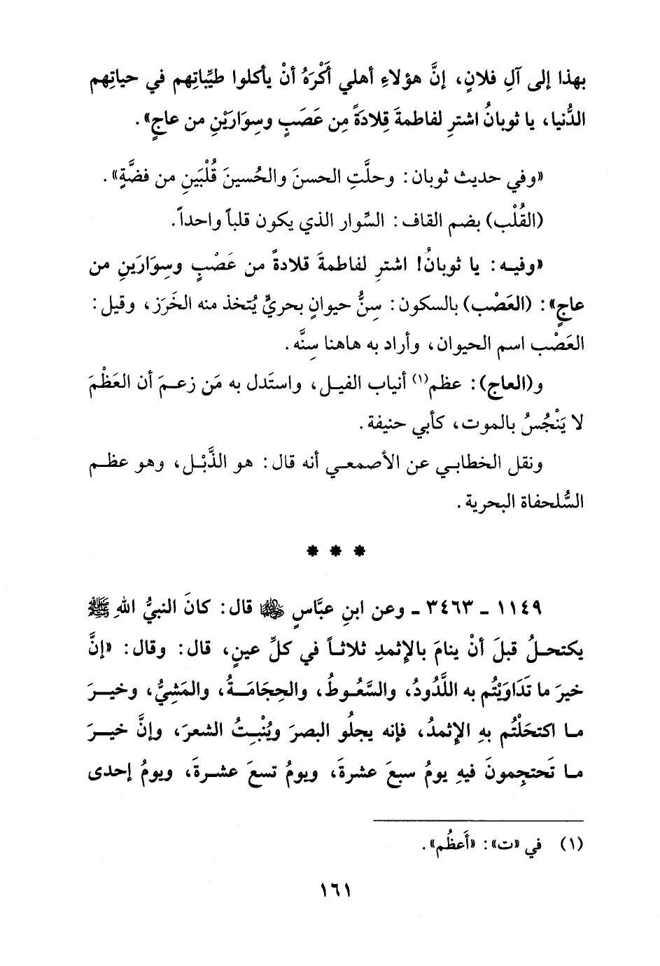"وفيه: يا ثوبان! اشتر لفاطمة قلادة من عصب وسوارين من عاج": (العصب) بالسكون: سن حيوان بحري يتخذ منه الخرز, وقيل: العصب اسم الحيوان, وأراد به هاهنا سنه.