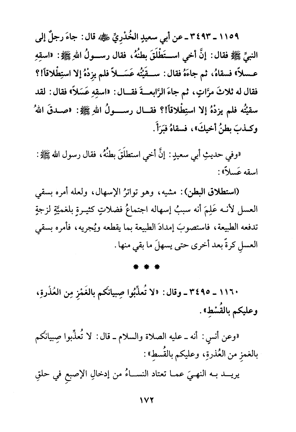 1160 – 3495 – وقال: "لا تعذبوا صبيانكم بالغمز من العذرة, وعليكم بالقسط"