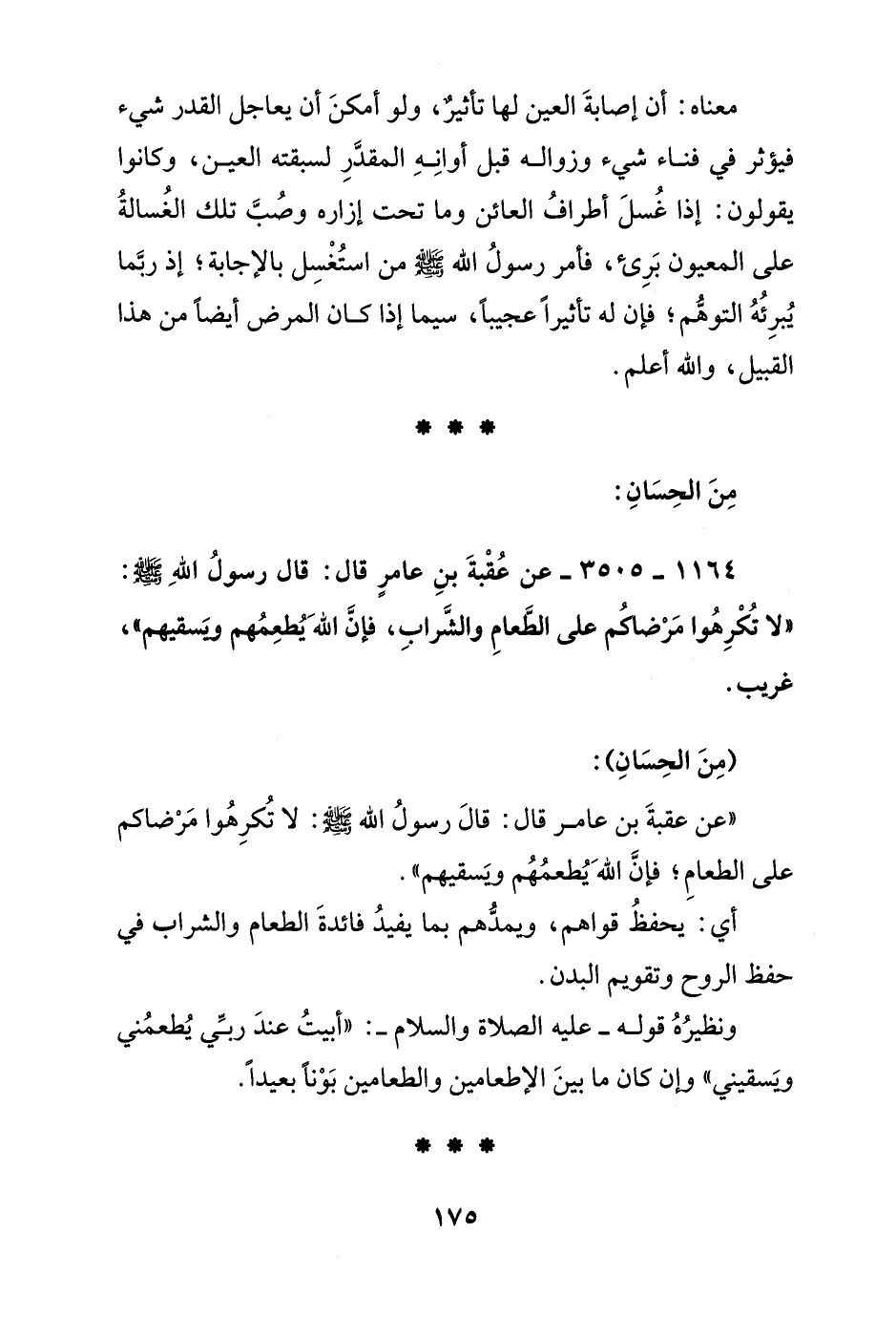 1164 – 3505 – عن عقبة بن عامر قال: قال رسول الله صلى الله عليه وسلم: "لا تكرهوا مرضاكم على الطعام والشراب, فإن الله يطعمهم ويسقيهم" غريب.