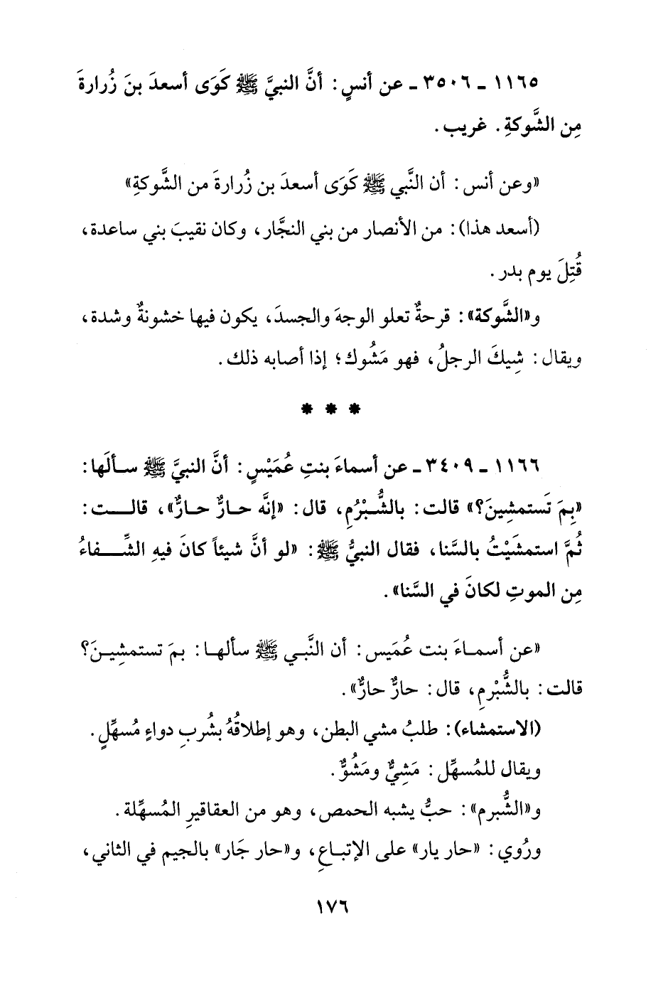 1165 – 3506 - عن أنس: أن النبي صلى الله عليه وسلم كوى أسعد بن زرارة من الشوكة. غريب.