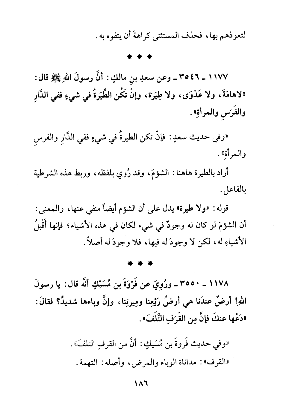 1177 - 3546 - وعن سعد بن مالك: أن رسول الله صلى الله عليه وسلم قال: لا هامة, ولا عدوى, ولا طيرة, وإن تكن الطيرة في شيء ففي الدار والفرس والمرأة"
