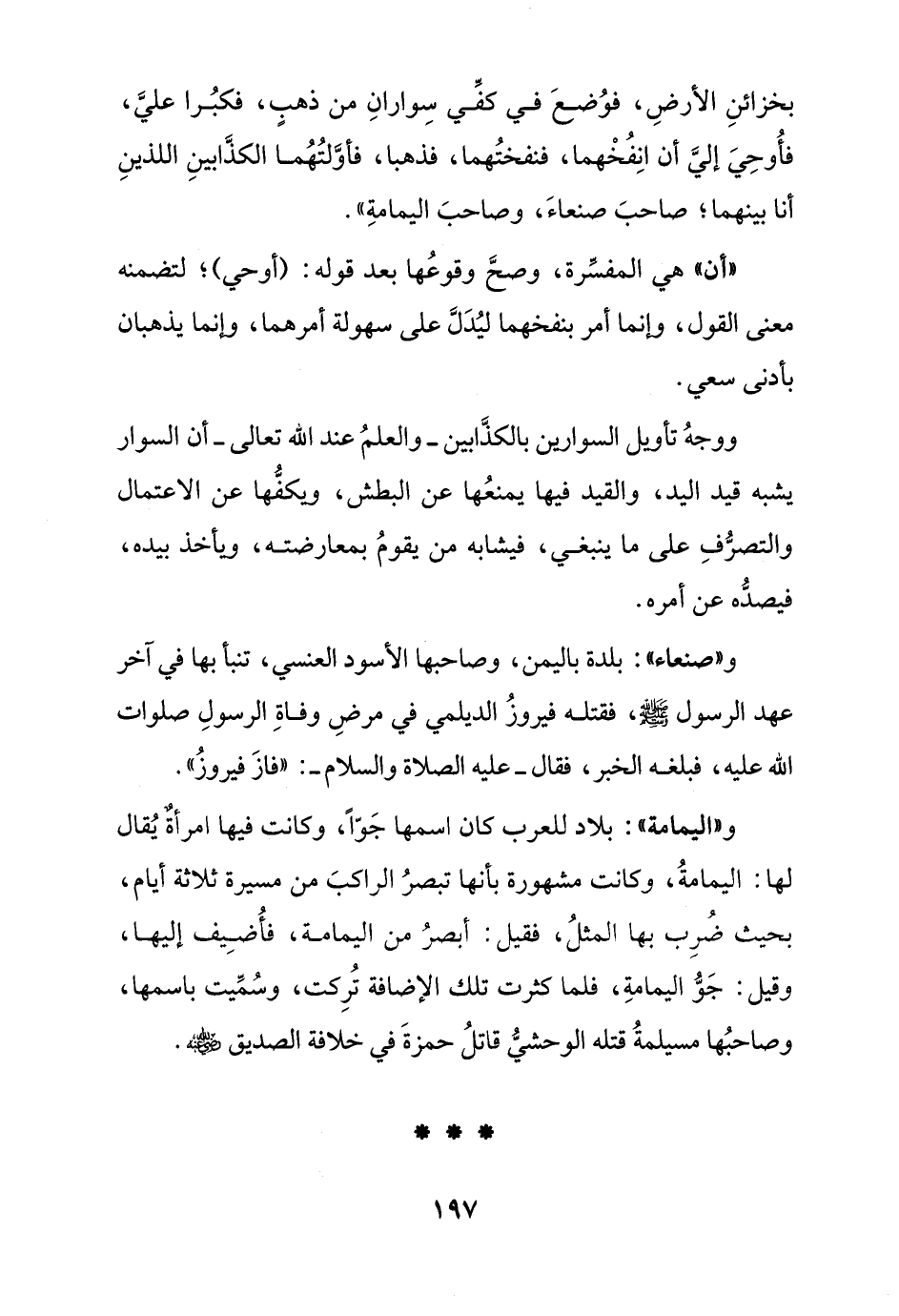 و"صنعاء": بلدة باليمن, وصاحبها الأسود العنسي, تنبأ بها في آخر عهد الرسول صلى الله عليه وسلم, فقتله فيروز الديلمي في مرض وفاة الرسول صلوات الله عليه, فبلغه الخبر, فقال- عليه الصلاة والسلام-: "فاز فيروز"