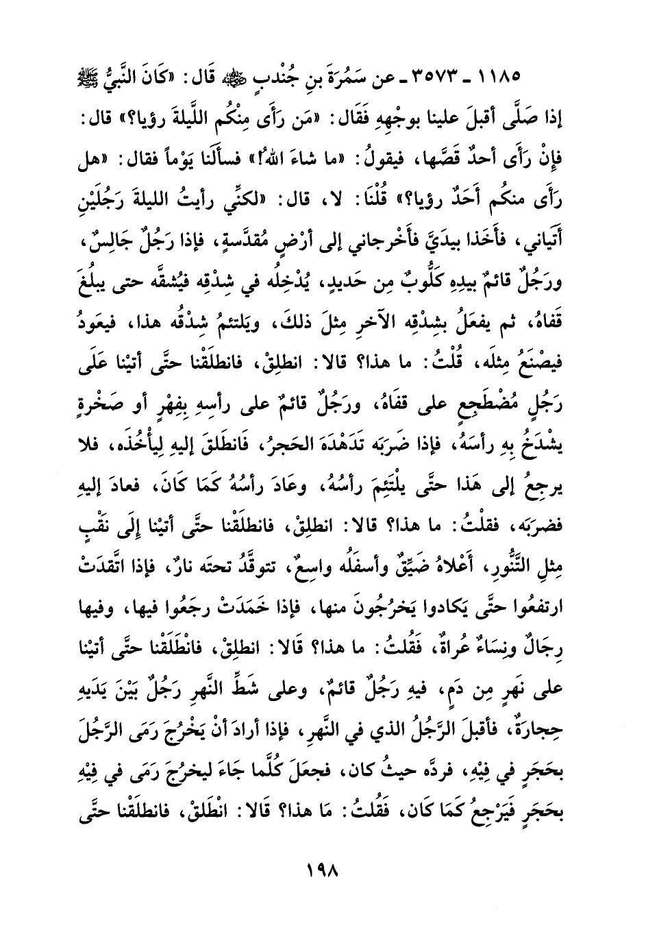 1185 - 3573 - عن سمرة بن جندب رضي الله عنه قال: "كان النبي صلى الله عليه وسلم إذا صلى أقبل علينا بوجهه فقال: "من رأى منكم الليلة رؤيا؟ قال: فإن رأى أحد قصها, فيقول: "ما شاء الله! " فسألنا يوما فقال: " هل رأى منكم أحد رؤيا؟ " قلنا: لا, قال: "لكني رأيت الليلة رجلين أتياني, فأخذا بيدي فأخرجاني إلى أرض مقدسة, فإذا رجل جالس, ورجل قائم بيده كلوب من حديد, يدخله في شدقه فيشقه حتى يبلغ قفاه, ثم يفعل بشدقه الآخر مثل ذلك, ويلتئم شدقه فيشقه هذا, فيعود فيصنع مثله, قلت: ما هذا؟ قالا: انطلق, فانطلقنا حتى أتينا على رجل مضطجع على قفاه, ورجل قائم على رأسه بفهر أو صخرة يشدخ به رأسه, فإذا ضربه تدهده الحجر, فانطلق إليه ليأخذه, فلا يرجع إلى هذا حتى يلتئم رأسه, وعاد رأسه كما كان, فعاد إليه فضربه, فقلت: ما هذا؟ قالا: انطلق, فانطلقنا حتى أتينا إلى نقب مثل التنور, أعلاه ضيق وأسفله واسع, تتوقد تحته نار, فإذا اتقدت ارتفعوا حتى يكادوا يخرجون منها, فإذا خمدت رجعوا فيها, وفيها رجال ونساء عراة, فقلت: ما هذا؟ قالا: انطلق, فانطلقنا حتى أتينا على نهر من دم, فيه رجل قائم, وعلى شط النهر رجل بين يديه حجارة, فأقبل الرجل الذي في النهر, فإذا أراد أن يخرج رمى الرجل بحجر في فيه, فرده حيث كان, فجعل كلما جاء ليخرج رمى في فيه بحجر فيرجع كما كان, فقلت: ما هذا؟ قالا: انطلق, فانطلقنا حتى