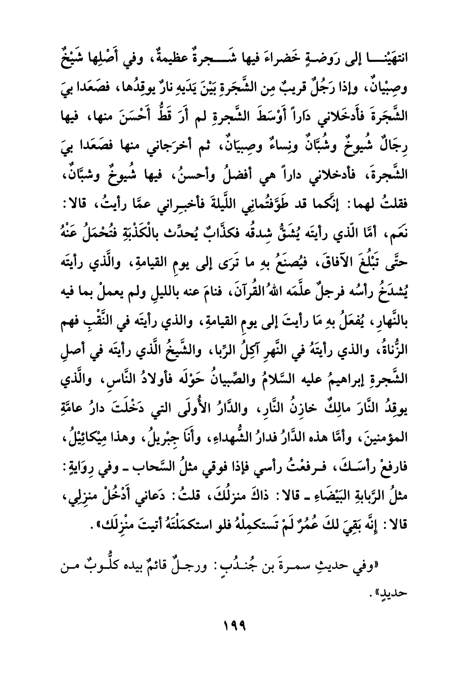 انتهينا إلى روضة خضراء فيها شجرة عظيمة, وفي أصلها شيخ وصبيان, وإذا رجل قريب من الشجرة بين يديه نار يوقدها, فصعدا بي الشجرة فأدخلاني دارا أوسط الشجرة لم أر قط أحسن منها, فيها رجال شيوخ وشبان ونساء وصبيان, ثم أخرجاني منها فصعدا بي الشجرة, فأدخلاني دارا هي أفضل وأحسن, فيها شيوخ وشبان, فقلت لهما: إنكما قد طوفتماني الليلة فأخبراني عما رأيت, قالا: نعم, أما الذي رأيته يشق شدقه فكذاب يحدث بالكذبة فتحتمل عنه حتى تبلغ الآفاق, فيصنع به ما ترى إلى يوم القيامة, والذي رأيته يشدخ رأسه فرجل علمه الله القرآن, فنام عنه بالليل ولم يعمل بما فيه بالنهار, يفعل به ما رأيت إلى يوم القيامة, والذي رأيته في النقب فهم الزناة, والذي رأيته في النهر آكل الربا, والشيخ الذي رأيته في أصل الشجرة إبراهيم عليه السلام والصبيان حوله فأولاد الناس, والذي يوقد النار مالك خازن النار, والدار الأولى التي دخلت دار عامة المؤمنين, وأما هذه الدار فدار الشهداء, وأنا جبريل, وهذا ميكائيل, فارفع رأسك, فرفعت رأسي فإذا فوقي مثل السحاب -وفي رواية: مثل الربابة البيضاء- قالا: ذاك منزلك, قلت: دعاني أدخل منزلي, قالا: إنه بقي لك عمر لم تستكمله فلو استكملته أتيت منزلك".