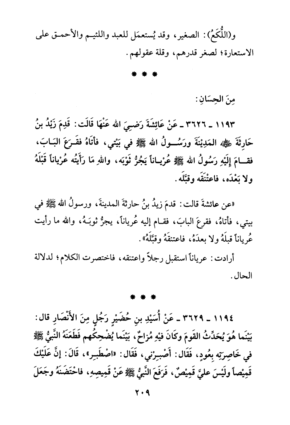1194 - 3629 - عن أسيد بن حضير رجل من الأنصار قال: بينما هو يحدث القوم وكان فيه مزاح, بينما يضحكهم فطعنه النبي صلى الله عليه وسلم في خاصرته بعود, فقال: أصبرني, فقال: "اصطبر", قال: إن عليك قميصا وليس علي قميص, فرفع النبي صلى الله عليه وسلم عن قميصه, فاحتضنه وجعل