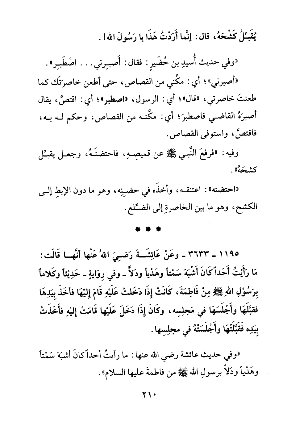 1195 - 3633 - وعن عائشة رضي الله عنها أنها قالت: ما رأيت أحدا كان أشبه سمتا وهديا ودلا-وفي رواية - حديثا وكلاما برسول الله صلى الله عليه وسلم من فاطمة, كانت إذا دخلت عليه قام إليها فأخذ بيدها فقبلها وأجلسها في مجلسه, وكان إذا دخل عليها قامت إليه فأخذت بيده فقبلتها وأجلسته في مجلسها.
