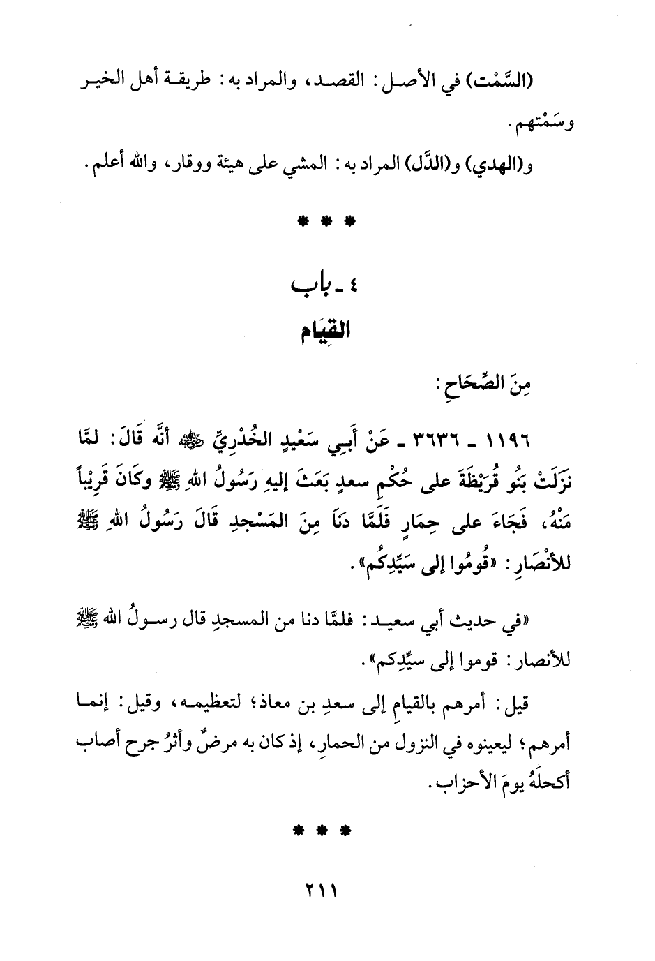 1196 - 3636 - عن أبي سعيد الخدري رضي الله عنه أنه قال: لما نزلت بنو قريظة على حكم سعد بعث إليه رسول الله صلى الله عليه وسلم وكان قريبا منه, فجاء على حمار فلما دنا من المسجد قال رسول اله صلى الله عليه وسلم للأنصار: "قوموا إلى سيدكم".