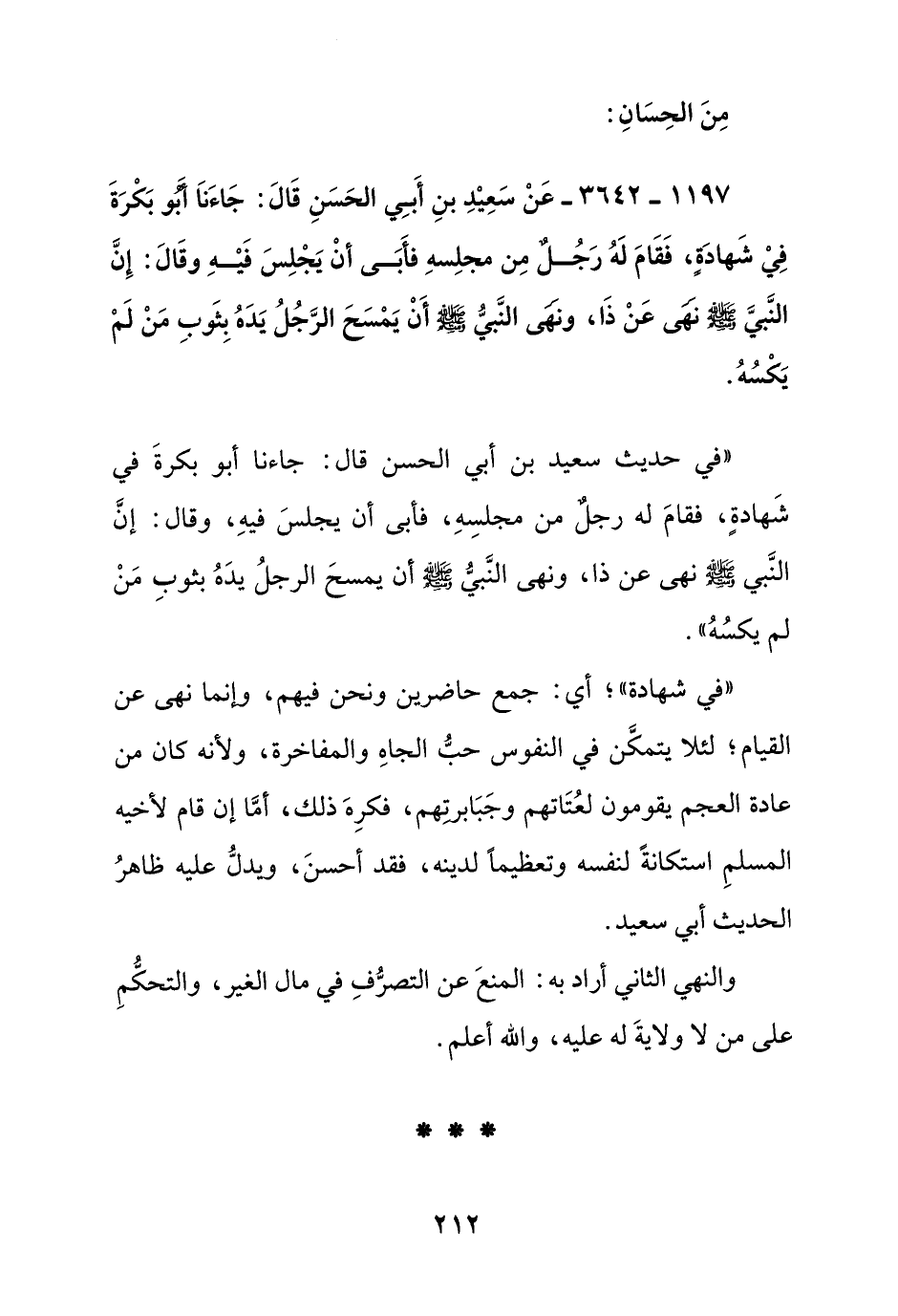 1197 - 3642 - عن سعيد بن أبي الحسن قال: جاءنا أبو بكرة في شهادة, فقام له رجل من مجلسه فأبى أن يجلس فيه وقال: إن النبي صلى الله عليه وسلم نهى عن ذا, ونهى النبي صلى الله عليه وسلم أن يمسح الرجل يده بثوب من لم يكسه.