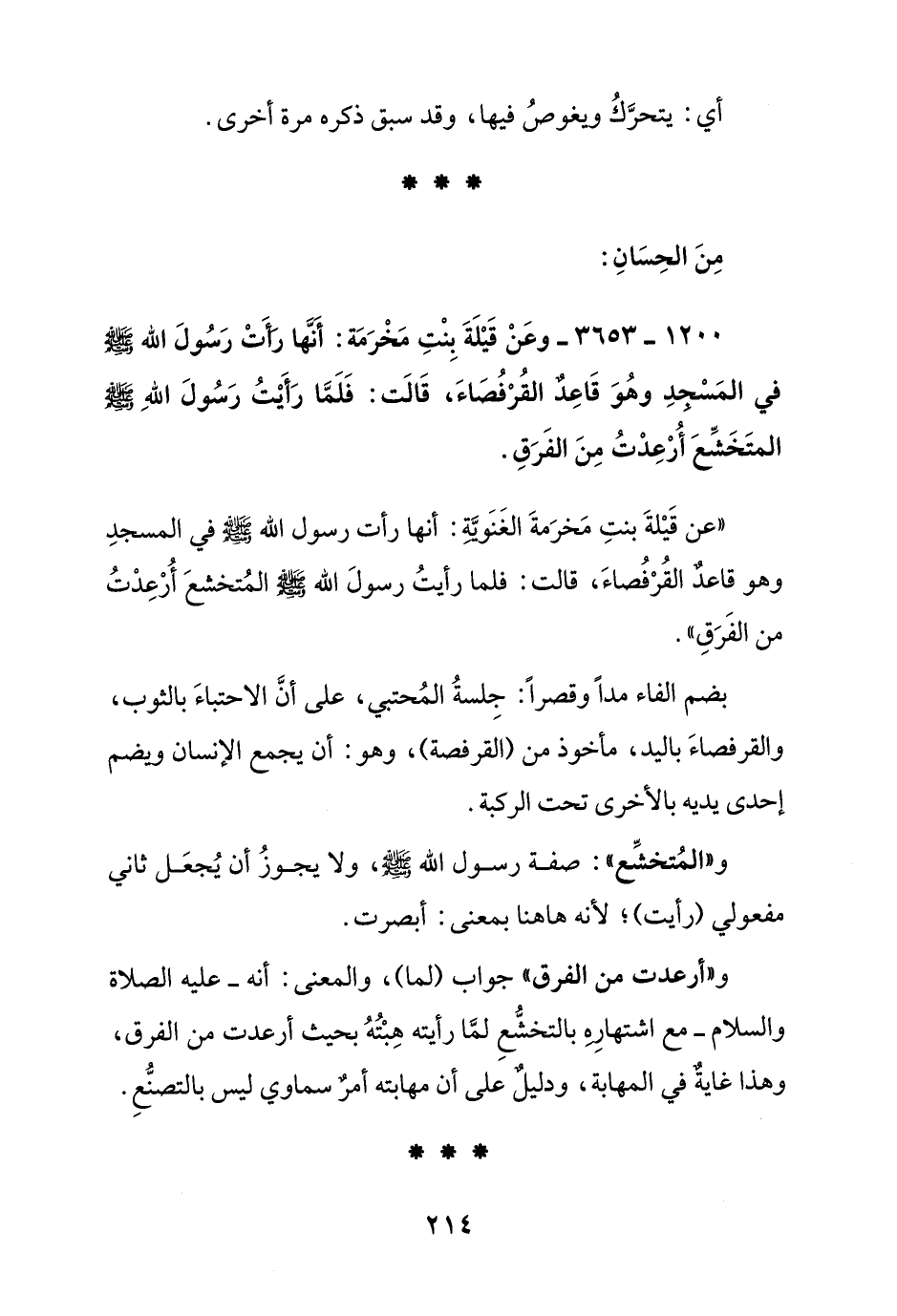 1200 - 3653 - وعن قيلة بنت مخرمة: أنها رأت رسول الله صلى الله عليه وسلم في المسجد وهو قاعد القرفصاء, قالت: فلما رأيت رسول الله صلى الله عليه وسلم المتخشع أرعدت من الفرق.