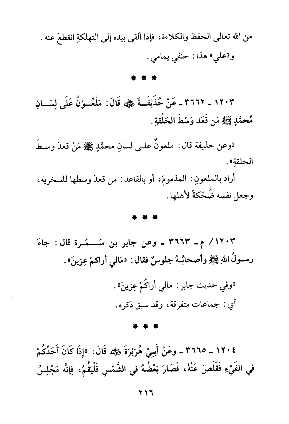 1203 - 3662 - عن حذيفة رضي الله عنه قال: ملعون على لسان محمد صلى الله عليه وسلم من قعد وسط الحلقة.