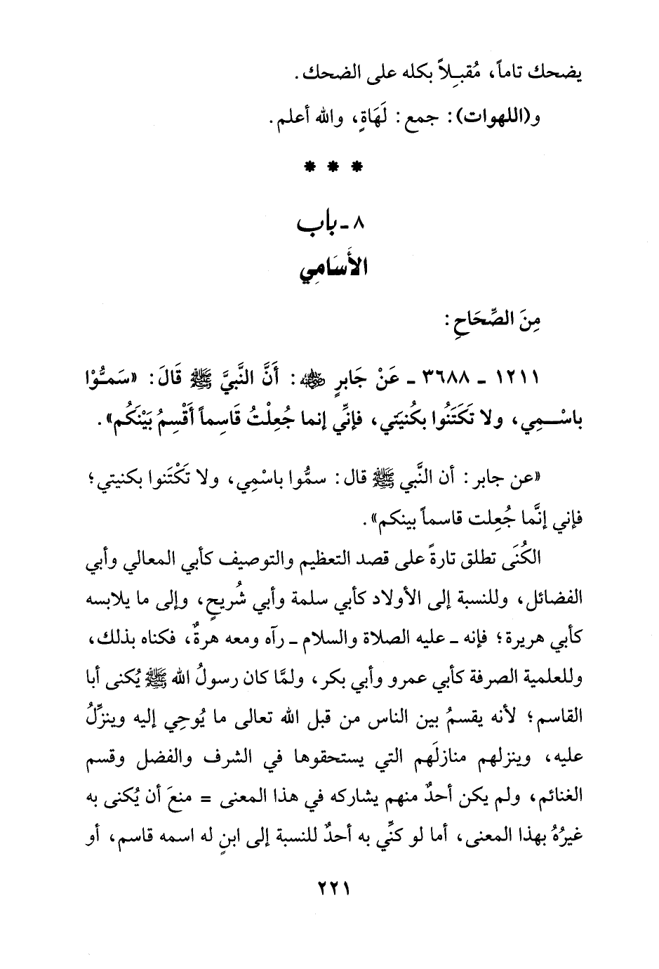 1211 - 3688 - عن جابر رضي الله عنه: أن النبي صلى الله عليه وسلم قال: سموا باسمي, ولا تكتنوا بكنيتي, فإني إنما جعلت قاسما أقسم بينكم"