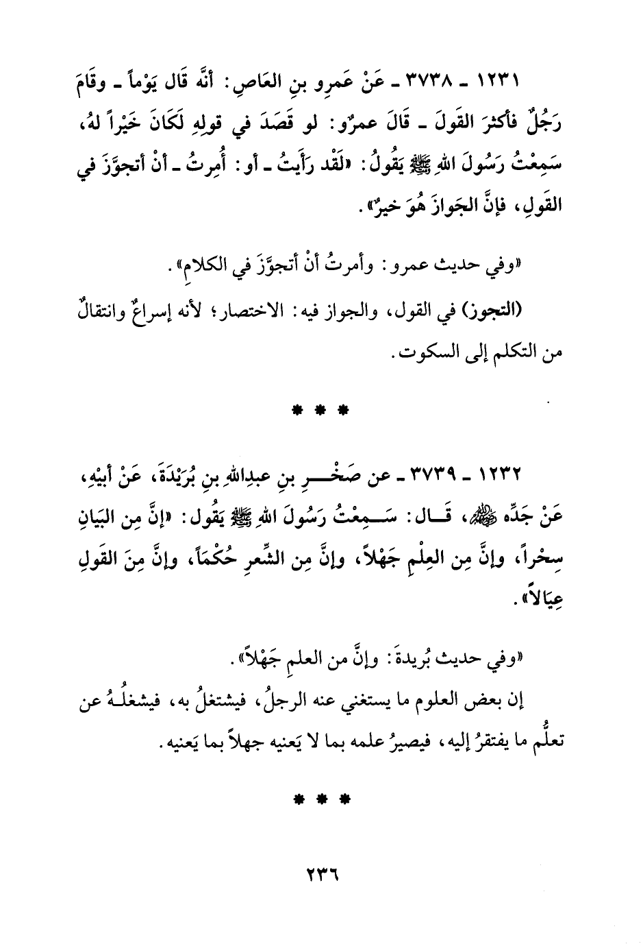 1232 – 3739 – عن صخر بن عبد الله بن بريدة عن أبيه, عن جده رضي الله عنه, قال: سمعت رسول الله صلى الله عليه وسلم يقول: "إن من البيان سحرا, وإن من العلم جهلا, وإن من الشعر حكما, وإن من القول عيالا"