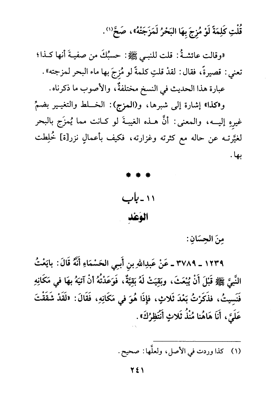 1239 - 3789 - عن عبد الله بن أبي الحسماء أنه قال: بايعت النبي صلى الله عليه وسلم قبل أن يبعث, وبقيت له بقية, فوعدته أن آتية بها في مكانه فنسيت, فذكرت بعد ثلاث, فإذا هو في مكانه, فقال: "لقد شققت علي, أنا هاهنا منذ ثلاث أنتظرك"
