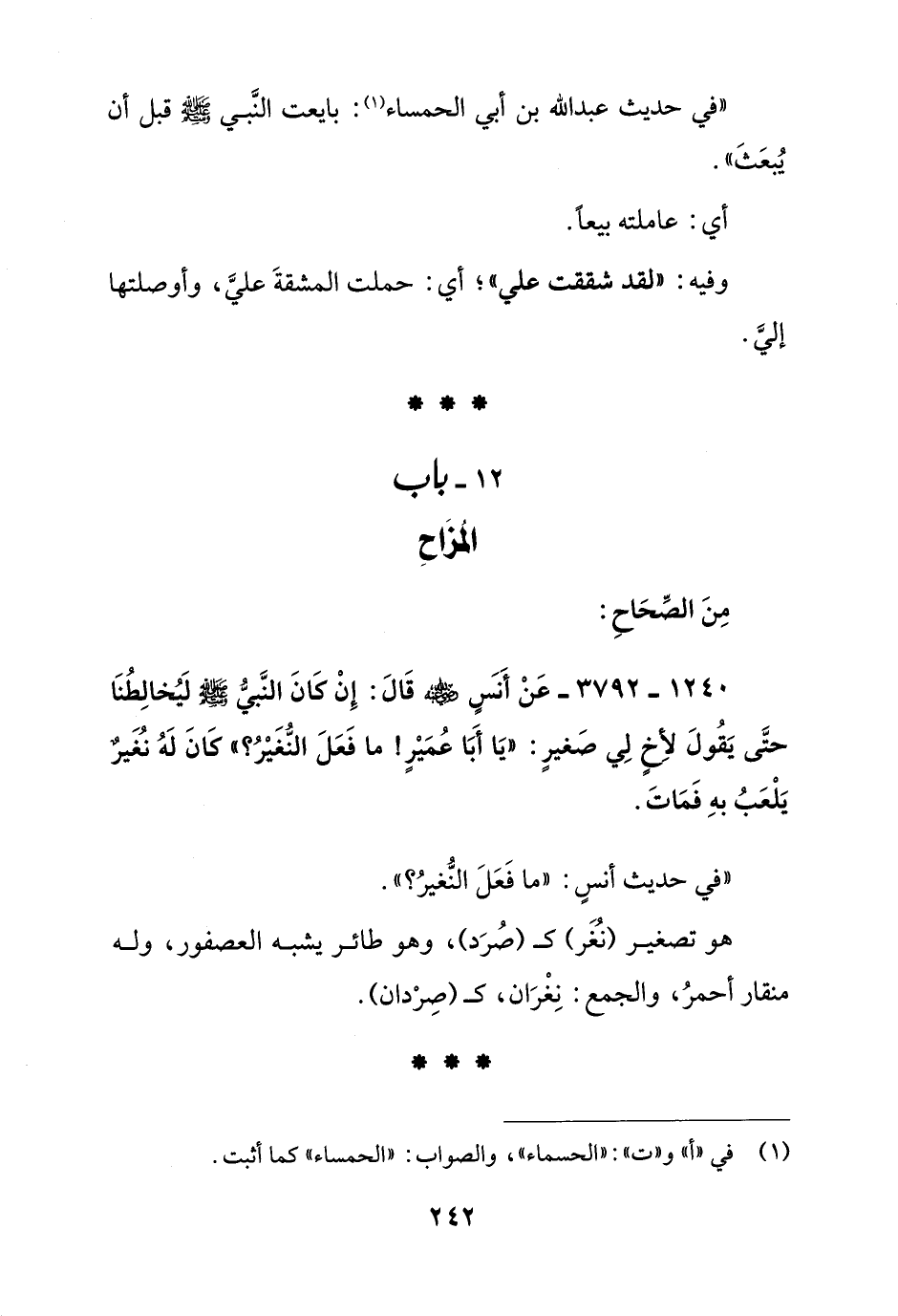 1240 - 3792 - عن أنس رضي الله عنه قال: إن كان النبي صلى الله عليه وسلم ليخالطنا حتى يقول لأخ لي صغير: "يا أبا عمير! ما فعل النغير؟ " كان له نغير يلعب به فمات.