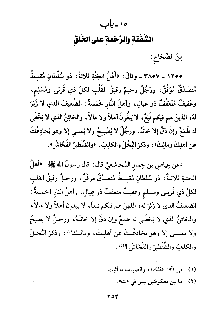 1255 - 3857 - وقال: "أهل الجنة ثلاثة: ذو سلطان مقسط متصدق موفق, ورجل رحيم رقيق القلب لكل ذي قربى ومسلم, وعفيف متعفف ذو عيال, وأهل النار خمسة: الضعيف الذي لا زبر له, الذين هم فيكم تبع, لا يبغون أهلا ولا مالا, والخائن الذي لا يخفى له طمع وإن دق إلا خانه, ورجل لا يصبح ولا يمسي إلا وهو يخادعك عن أهلك ومالك", وذكر البخل والكذب, "والشظير الفحاش"