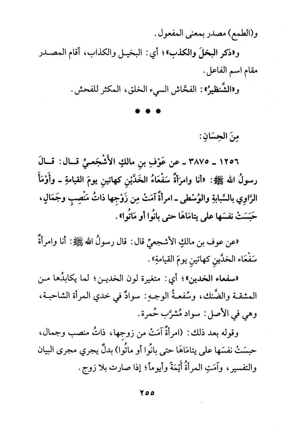 1256 - 3875 - عن عوف بن مالك الأشجعي قال: قال رسول الله صلى الله عليه وسلم: "أنا وامرأة سفعاء الخدين كهاتين يوم القيامة -وأومأ الراوي بالسبابة والوسطى- امرأة آمت من زوجها ذات منصب وجمال, حبست نفسها على يتاماها حتى بانوا أو ماتوا"