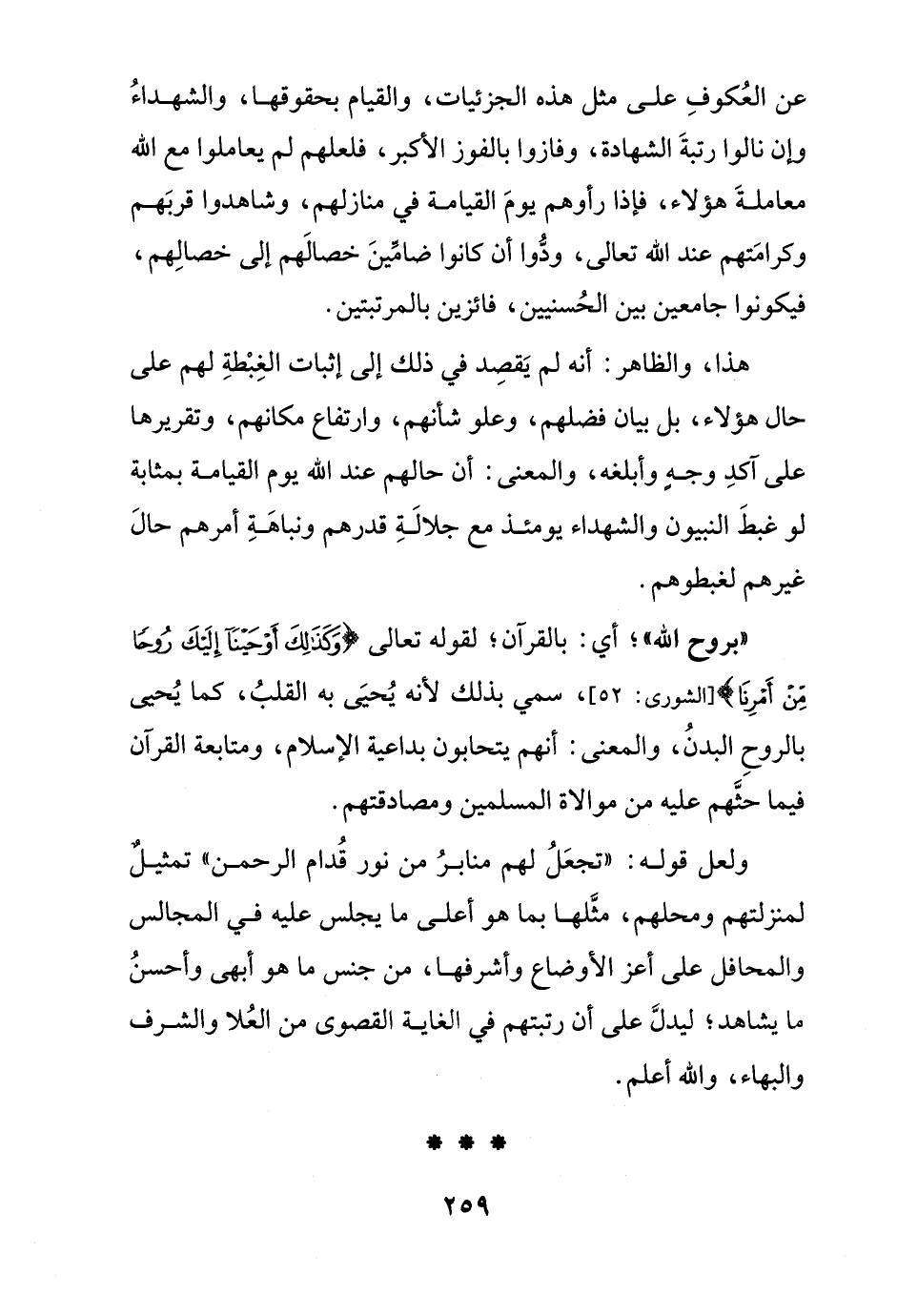 عن العكوف على مثل هذه الجزئيات, والقيام بحقوقها, والشهداء وإن نالوا رتبة الشهادة, وفازوا بالفوز الأكبر, فلعلهم لم يعاملوا مع الله معاملة هؤلاء فإذا رأوهم يوم القيامة في منازلهم, وشاهدوا قربهم وكرامتهم عند الله تعالى, ودوا أن كانوا ضامين خصالهم إلى خصالهم, فيكونوا جامعين بين الحسنيين, فائزين بالمرتبتين.