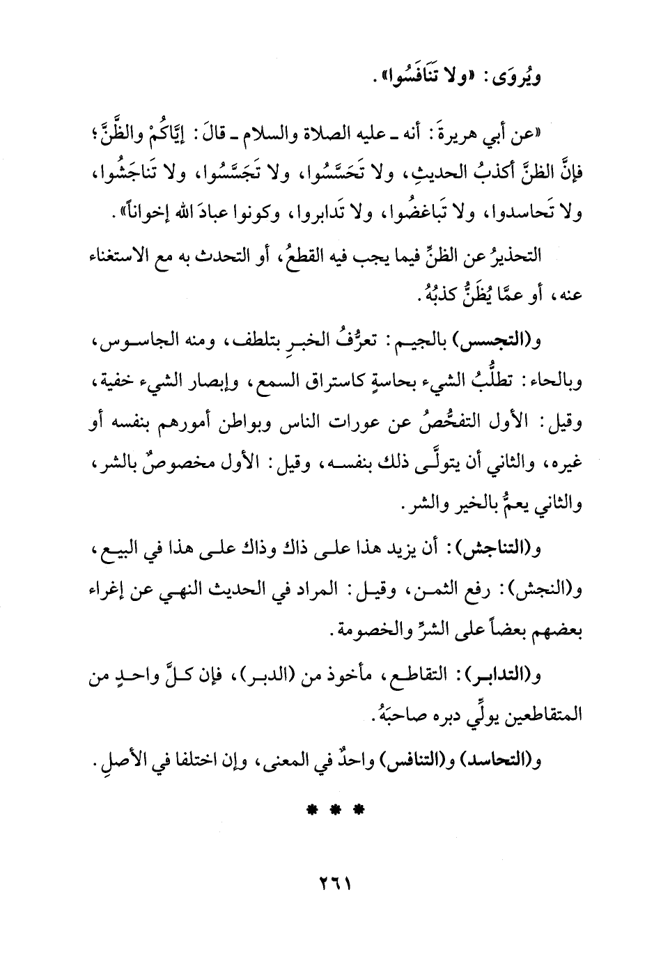 "عن أبي هريرة: أنه -عليه الصلاة والسلام- قال: إياكم والظن, فإن الظن أكذب الحديث, ولا تحسسوا, ولا تجسسوا, ولا تناجشوا, ولا تحاسدوا, ولا تباغضوا, ولا تدابروا, وكونوا عباد الله إخوانا"